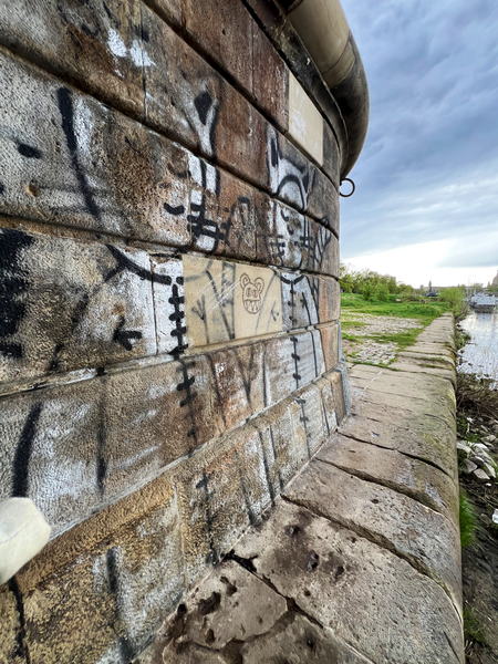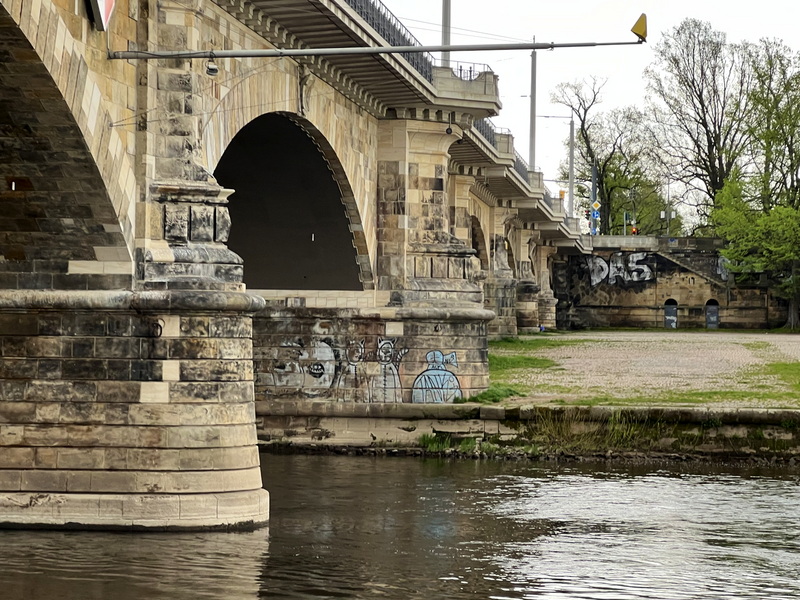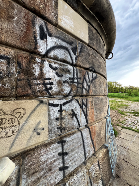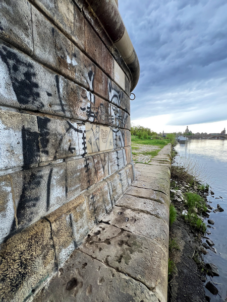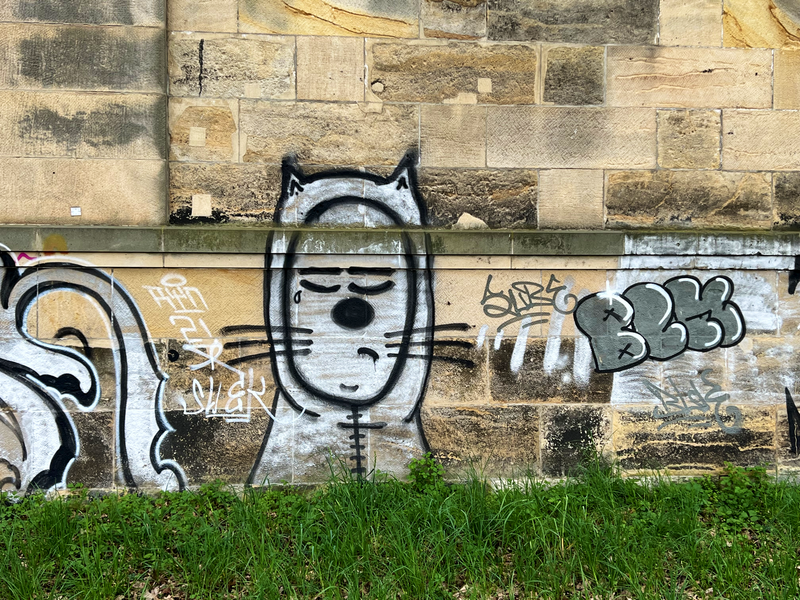 Ich denke nach wie vor, dass die Ära der ACHSO-Katze beendet ist. Aber es gibt immer noch neue entdeckte ACHSO-Katzen. Diese waren wahrscheinlich schon lange da, aber eben noch nicht gesehen. So ging es mir mit den zwei Katzen an der Albertbrücke auf der Altstadtseite. Dazu musst man eben mal Dampfer fahren. Sonst hätte ich diese ACHSO-Katzen auch nie entdeckt. Die Katzen tragen in der IAKK (Interaktive ACHSO-Katzen-Karte) die Nummern 155/156. Und nach der Dampferfahrt habe ich am Terrassenufer (zwischen der eingestürzten Carolabrücke und Albertbrücke) die ACHSO-Katze 154 entdeckt.