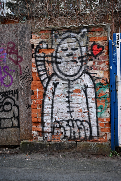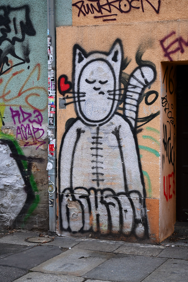 Wie geht es eigentlich den ACHSO-Katzen im Antifa-Viertel? Im Hechtviertel um die Rudolfstraße und Friedensstraße sind auf alle Fälle noch alle ACHSO-Katzen da. Allerdings macht sich auch hier die Unart breit, die Katzengraffitis um zu verunstalten. Das ist nicht schön, aber zumindest fehlt noch keine Katze. Meist wird der Schmollmund der ACHSO-Katze verändert. Leider ist das eben gerade das Markenzeichen der ACHSO-Katze. Aber so ist es mit der Graffiti-Kunst. Im Lauf der Zeit verändert sie sich oder verschwindet ganz.