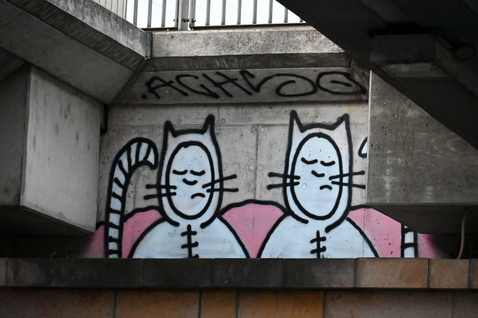 Sensationell, es ist passiert! Die ACHSO-Katze hat sich über die Brücke in die Dresdner Altstadt geschlichen. Oder ist sie doch geschwommen??? Man weiß es nicht. Egal - die Katze ist nun auch auf der anderen Elbseite von Dresden angekommen. Gesichtet habe ich die ACHSO-Katze unter der Eisenbahnbrücke am Ostra-Ufer.