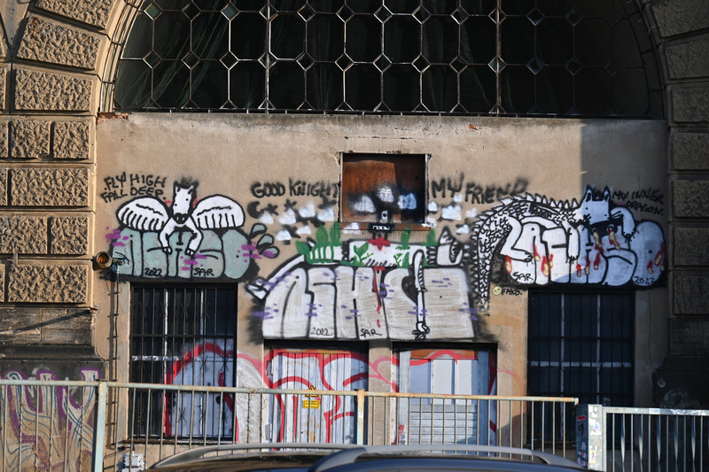 P.S. Interessant ist ein Fundstück an der Eisenbahnstrecke im Hecht-Viertel. Dort sieht man das geflügelte Pferd, welches schon mit der Katze über dem Art&Form auf der Bautzner Straße zu sehen war, aber ganz ohne Katze.