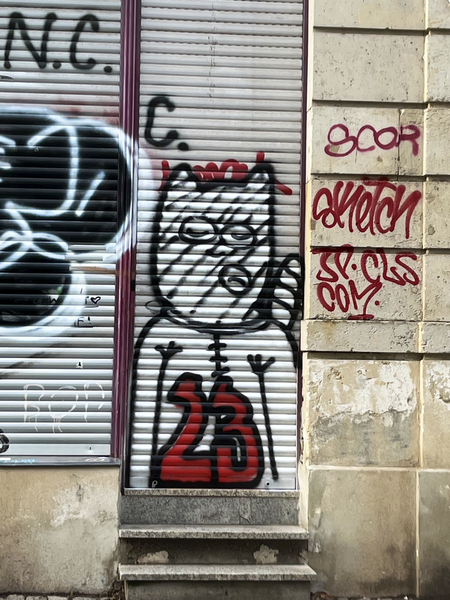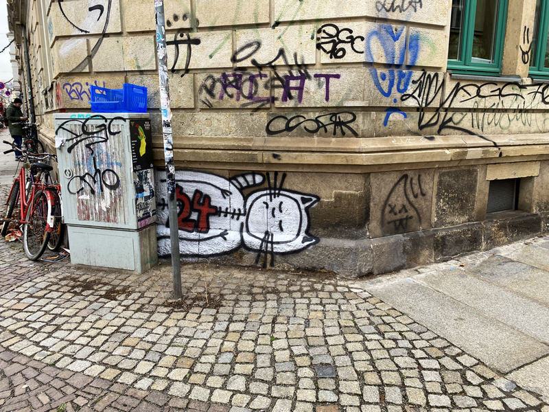 Die Schwierigkeiten bei der Suche nach den Advents-Katzen 2023 sind zwar noch nicht ganz ausgeräumt, aber es geht doch weiter. Die Adventskalender-ACHSO-Katzen Nummer 23 und 24 sind aufgetaucht und gefunden. Die Katze Nummer 23 ist wieder auf ein Ladenrolle gesprüht und deshalb oft nur halb oder auch gar nicht sichtbar. Die Katze Nummer 24 ist die erste liegende Katze die ich gefunden habe. Es gibt also immer wieder etwas Neues zu entdecken. Ich bleibe weiter optimistisch. Die restlichen Katzen werden auch noch auftauchen.