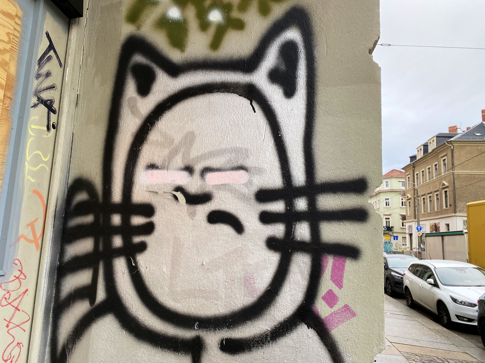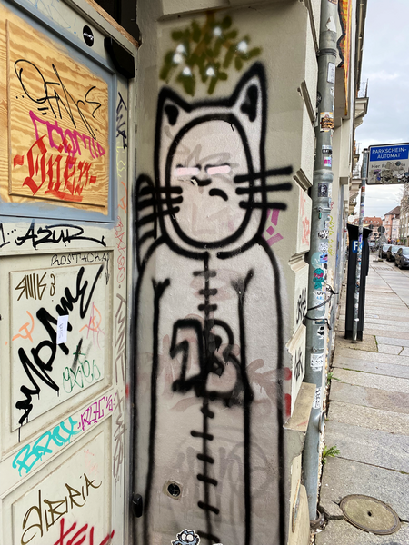 Zur Zeit gibt es zwei Probleme mit der ACHSO-Katze. Erstens kommt es zu immer mehr Vandalismus an schon bestehenden ACHSO-Katzen. Nach der Verunstaltung der Katzen an der ehemaligen Bäckerei Rißmann wurde nun eine Katze „geblendet”. Dabei handelt es sich um die ACHSO-Katze Nummer 13 auf dem Bischofsweg aus dem ersten ACHSO-Katzen-Adventskalender. Die ACHSO-Katze Nummer 12 gleich gegenüber gibt es schon nicht mehr. Schade.