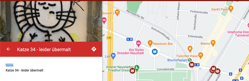 Nun ist auch eine meiner Lieblings-ACHSO-Katzen einfach ausgelöscht wurden. An ein Hauswand auf der Fritz-Reuter-Straße war unter einem Fenster eine sehr schöne ACHSO-Katze gesprüht. Ich bin diese Strecke oft gefahren und habe mich auch abends und nachts an der Katze erfreut, weil sie so schön geleuchtet hat. Außerdem war sie noch das Lumpel unter den ACHSO-Katzen, weil oft unter ihr Sachen zur kostenlosen Mitnahme standen. Nun ist sie einfach weg - übermalt. Schade.