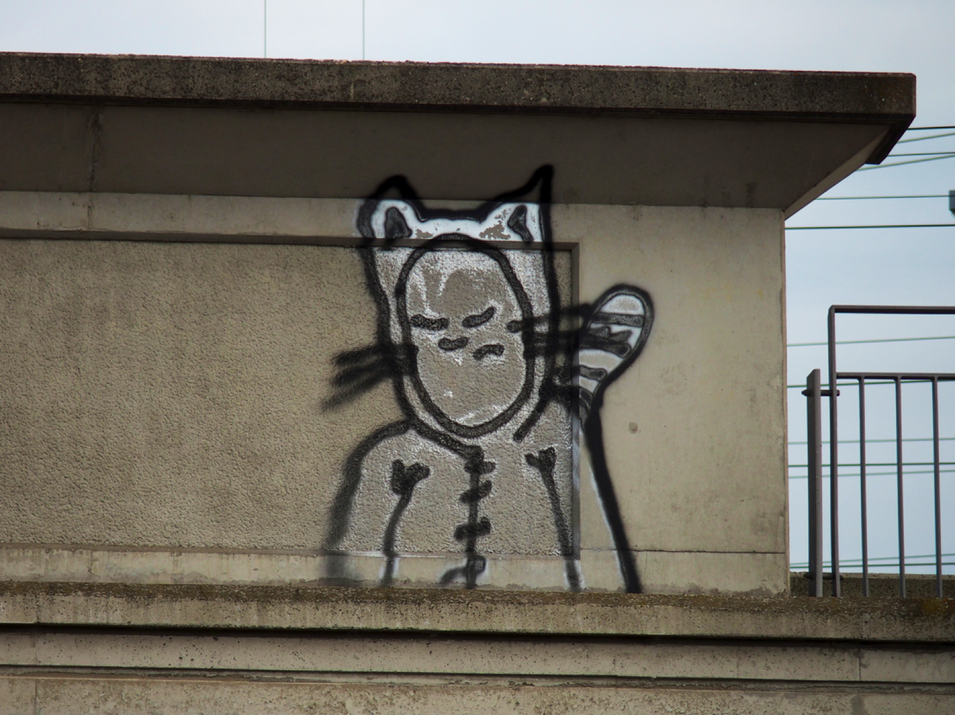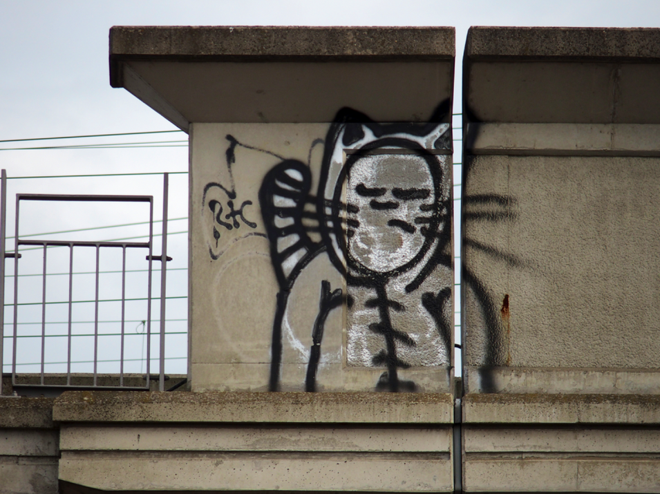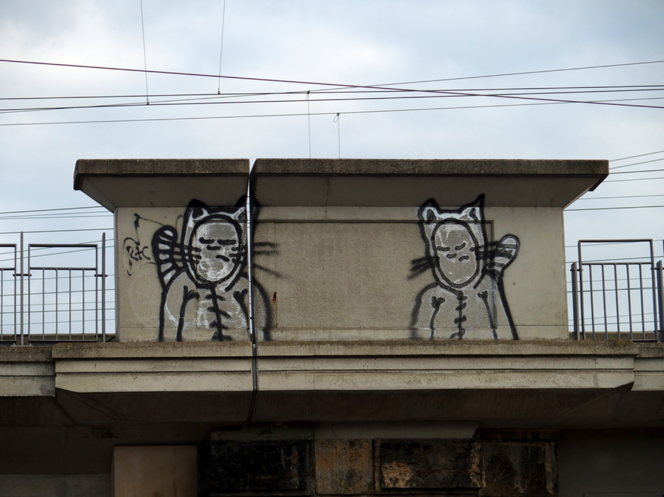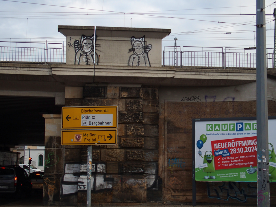 Gibt es Neuigkeiten von der ACHSO-Katze? Leider nicht!!! Weit und breit sind meiner Meinung nach keine neuen ACHSO-Katzen aufgetaucht. Im Alltagsbild der Neustädter Stadtseite von Dresden sind die vielen ACHSO-Katze natürlich immer noch sehr präsent. Jedoch sieht man einigen Katzen schon stark die Spuren der Verwitterungen durch Luft, wind und Regen an. Es nagt also der Zahn der Zeit an den Katzen. Andere Katzen strahlen nach wie vor besonders im Dunklen in ihrem silbrigen Gewand von den Hauswänden. Ja, wird es einen dritten Adventskalender mit der ACHSO-Katze geben? Wir werden sehen. Und zum Schluss - da war doch noch was. Bei einer Autofahrt durch die Eisenbahnstraße in der Nähe vom Bahnhof Neustadt habe ich doch tatsächlich zwei ACHSO-Katzen entdeckt, die noch nicht auf IAKK (Interaktive ACHSO-Katzen-Karte) vermerkt sind. Die zwei Katzen befinden sich über der Eisenbahnbrücke. Ich denke zwar, dass es sich um ältere ACHSO-Katzen handelt, aber wer weiß - vielleicht ist es ja ein Zeichen!