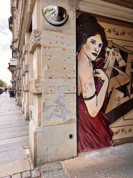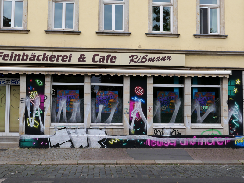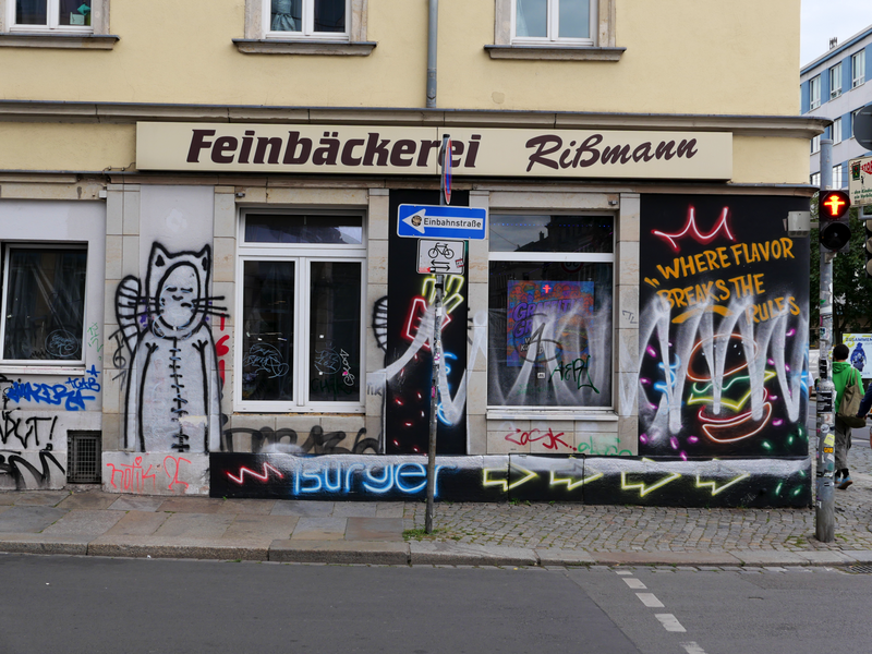 Nun sind die Katzen aber komplett verschwunden, einfach mit einem anderen Graffiti übermalt. Selbst von einer Katzen um der Ecke (auf der Louisenstraße) ist nur noch ein Stück Schwanz zu sehen. Schade, schade, schade …!