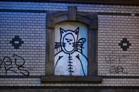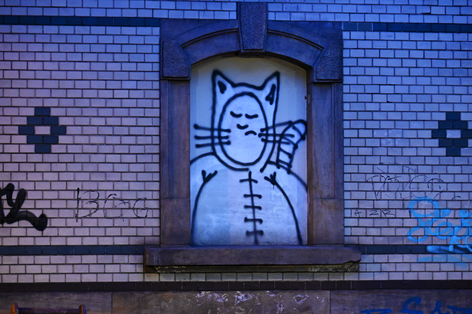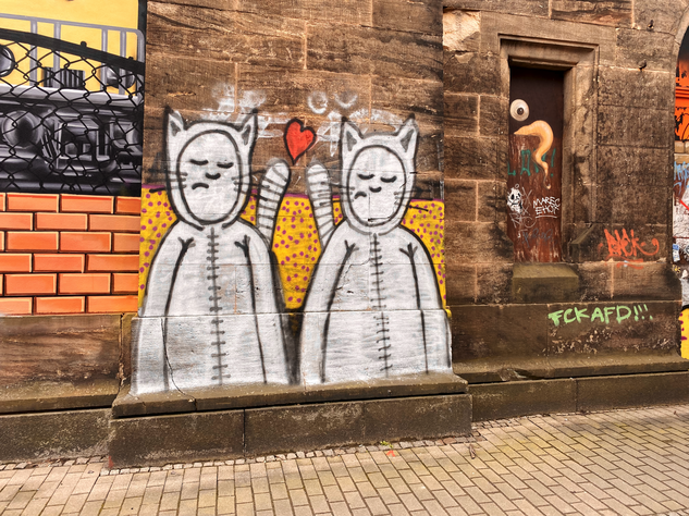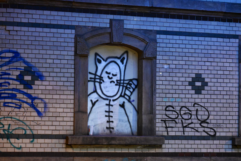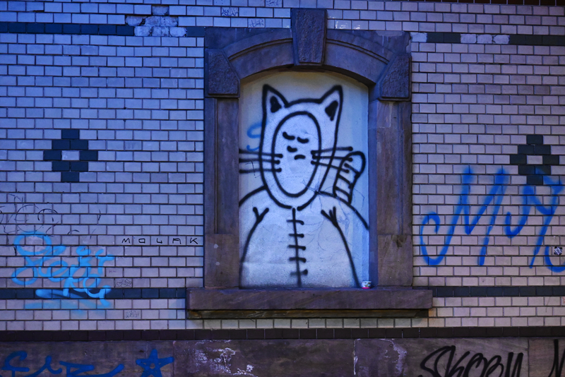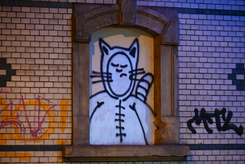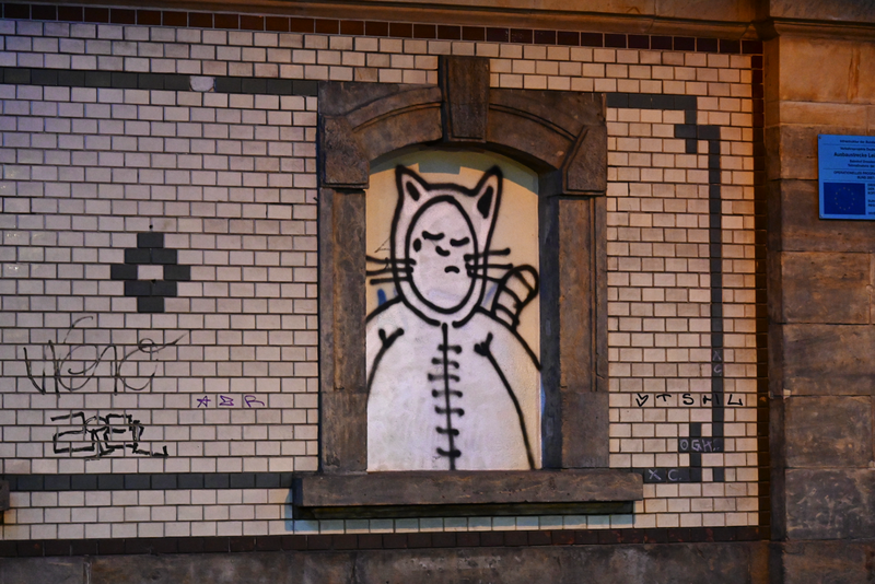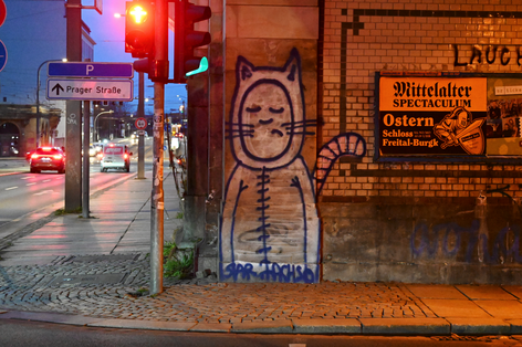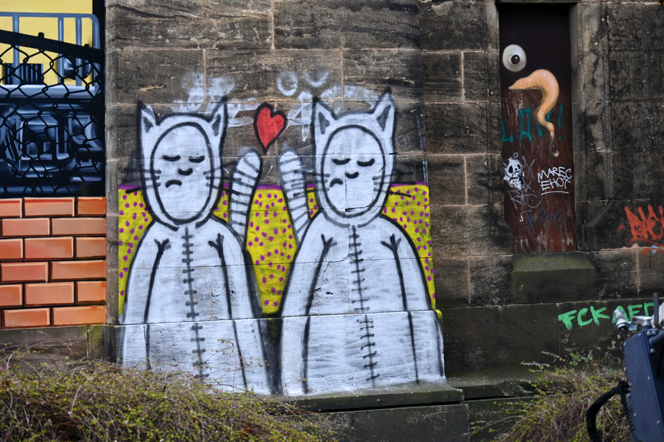 Die Katze schleicht um den Neustädter Bahnhof. Im Gebiet um den Neustädter Bahnhof in Dresden habe ich ganz viele neue Katzenbilder entdeckt. Nicht ganz neu aber auffällig sind dabei die Katzenpaare. Sehr schön sind auch die vielen „Katzenporträts” unter der Brücke auf der Hansastraße im Rahmen. Sieht aus wie eine Ahnengalerie.