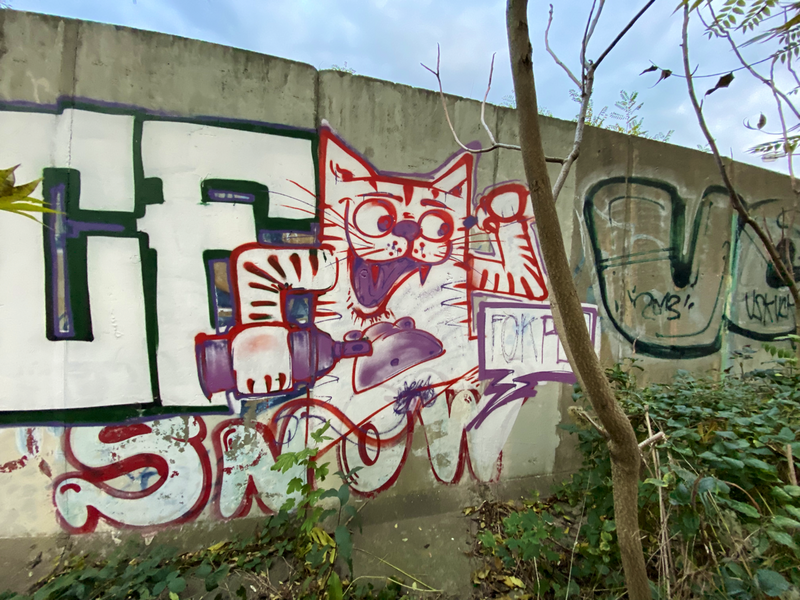 Dresden ist scheinbar prädestiniert für Streetart-Katzen. So ist die Neustadt-Katze im gleichnamigen Stadtviertel aktiv. Die ACHSO-Katze treibt sich im gesamten Gebiet der Neustädter Seite von Dresden herum. Und die Simon’s-Cat stromert ebenfalls durch die Dresdener Neustadt. Und nun kommt noch die Sprayer-Katze von der Leipziger Straße und Umgebung dazu. Ja, auf meiner Suche nach neuen ACHSO-Katzen war ich im Gebiet der Leipziger Straße und der Hafen-City unterwegs. Und dort habe ich keine ACHSO-Katze aber dafür eine ganz neue Streetart-Katze entdecken können. Es ist die Sprayer-Katze, die sich oft hinter Grünpflanzen an der Mauer entlang der Leipziger Straße in der Nähe zum Neustädter Bahnhof aufhält und versteckt.