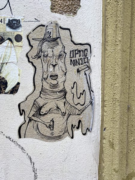 Allerdings klebt der Graffitikünstler „OPTIC NINJA” auch ganz feine Strichzeichnungen von allerlei komischen Wesen, versehen mit seinem Signum an die Wände. Auch die Paste-Up findet man am häufigsten in den Straßen um den Martin-Luther-Platz.