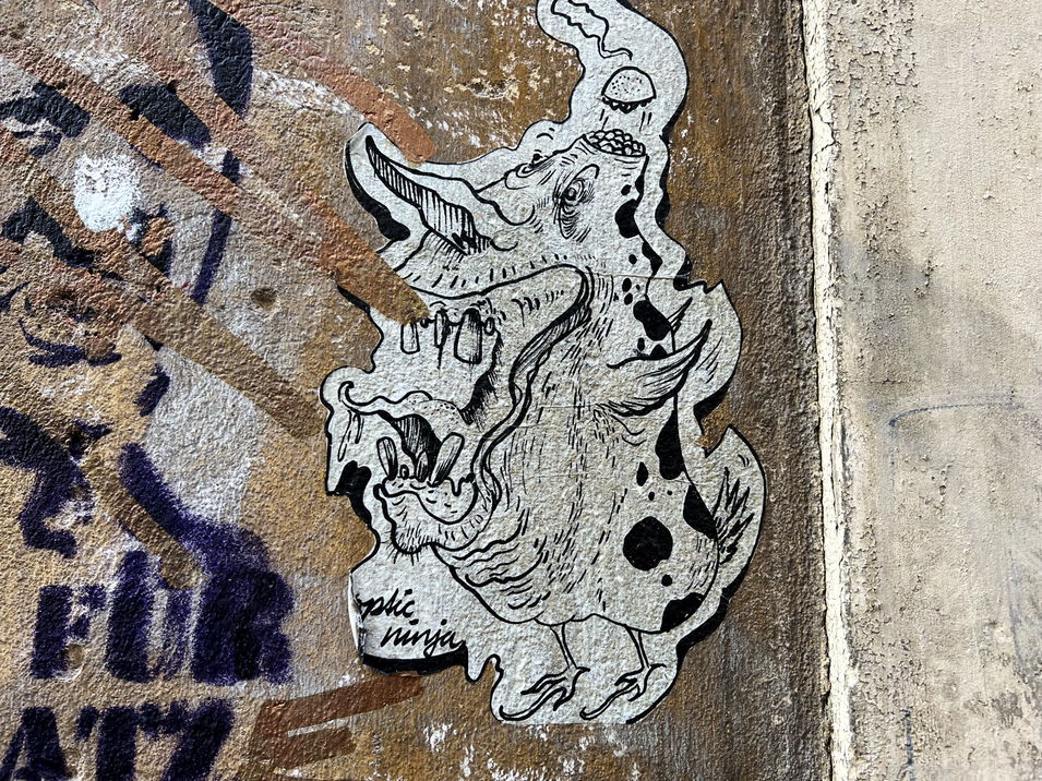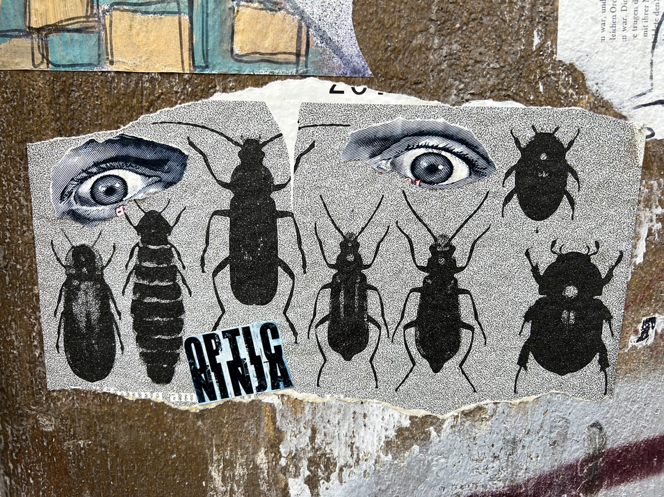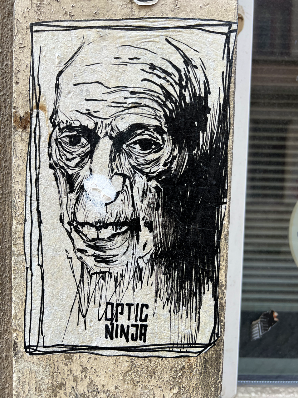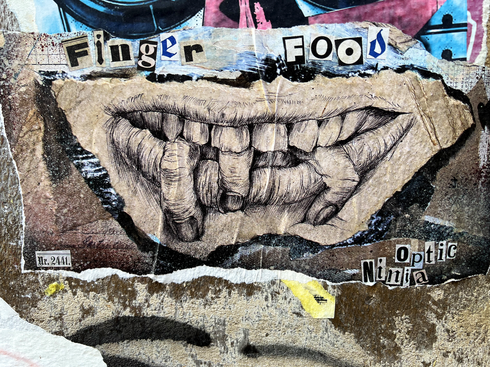 Eigentlich ist der Graffiti-Künstler „OPTIC NINJA” ja bekannt für seine ausgezeichneten feinen Strichzeichnungen. Oft sind die Motive verschrobene Figuren wie auf dem Märchen oder auch Tiere und vieles mehr. In der letzte Folge überraschte es uns mit einer sehr einfach Kin der Zeichnung. Nun habe ich wieder etwas Neues gefunden. Es sind zwei Collagen. Dabei hat er zu den eigentlichen Zeichnungen noch Buchstaben und Bilder aus Zeitungen dazu gefügt. Auch sein Signet gestaltet es oft in verschieden Schriftformen und Darstellungen. Natürlich sind bei den neuen Fundstücken auch eine sehr markante Zeichnung wieder dabei die mit so etwas an die Zeichnungen der berühmten Malerin Käte Kollwitz erinnert. Hier die neuen Fundstücke des „OPTIC NINJA”: