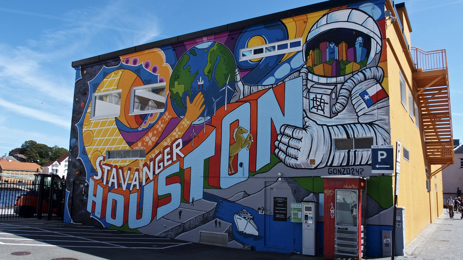 In Stavanger kann man in der Innenstadt eine sehr bunte Street Art Szene beobachten. Schon am Schiffsanleger prangt ein großes Graffiti mit dem Ortsnamen.