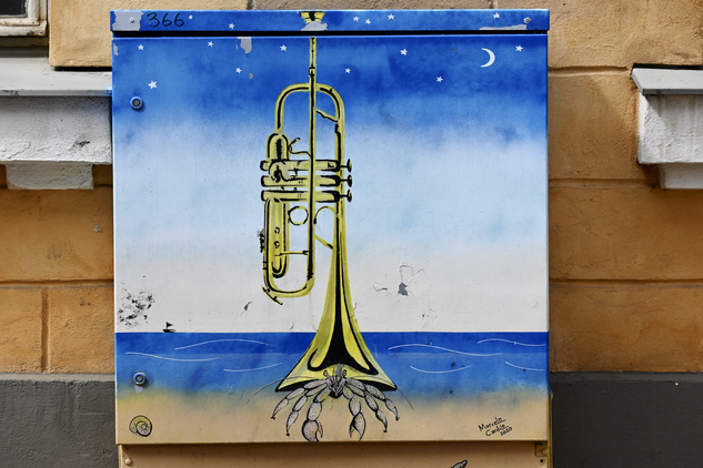 - klassisches Graffiti auf einen Telefonschaltkasten - Trompete (mit Signatur von Marcelo Cardilo 2020)