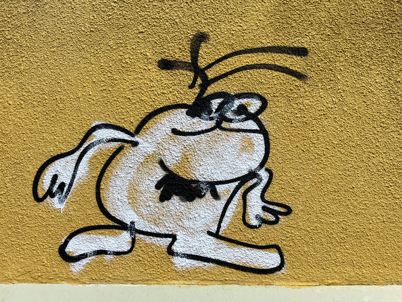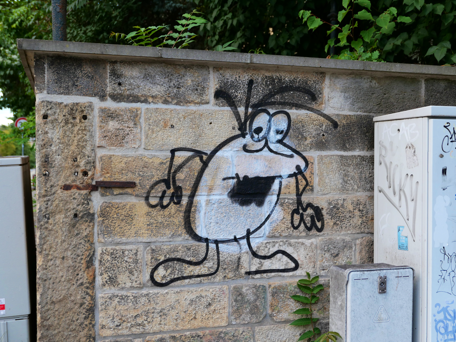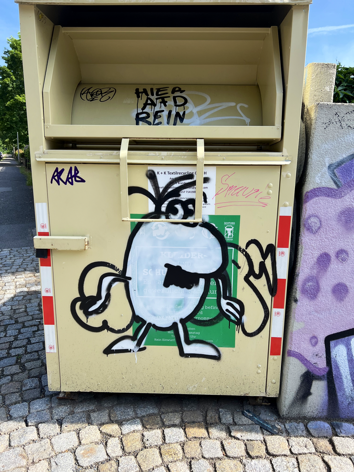 Manchmal ist man ein bisschen ratlos. Bei meinen Streifzügen durch die Streetart-Szene der Dresdener Neustadt begegnet mir (ich nenn ihm mal …) der keine „böse” Mann. Ich kann ihn nicht so richtig ignorieren. Aber ich weiß auch nicht, was mir dieses Graffiti für eine Botschaft sagen soll. Der Bart und auch die typischen Haar weißen auf diese geschichtliche Person hin und ich hoffe, dass der Künstler natürlich zur Antifa-Bewegung gehört und sich über die Person lustig macht. Der Gedanke könnte einen kommen, wenn man den Textzusatz bei dem Graffiti über der Kleiderspende ließt.