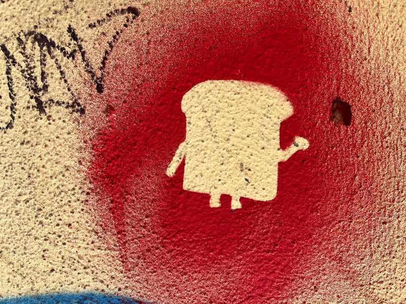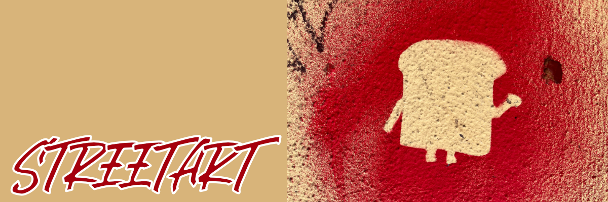 Das zweite Stencil-Graffiti benutze keine Schablone in weiteren Sinne, sondern das eigentliche Graffiti (wahrscheinlich eine Toast-Scheibe mit Armen und Beinen) wurde als Schablone benutzt. Die entstand das Bild als eine Art Negativ. Das ist so ähnlich wie die ersten Stencil-Graffiti auf der Welt, z. B. Die Hände in der Höhle von Lascaux. Diese Form eines Stencil-Graffiti ist echt warm selten.