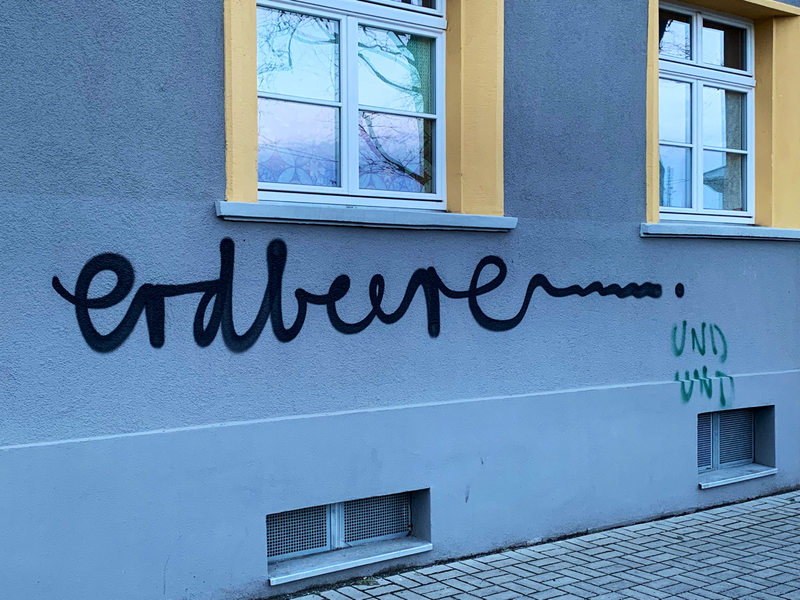 In Pieschen in der Nähe des Schul-Campus ist an ein Haus der Schriftzug „Erdbeeren” gesprüht. Ich musste gleich an meine Jugend denken. Da gab es so einen amerikanischen Kultfilm mit dem Titel „Blutige Erdbeeren”.