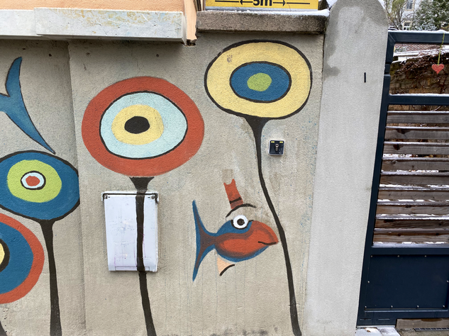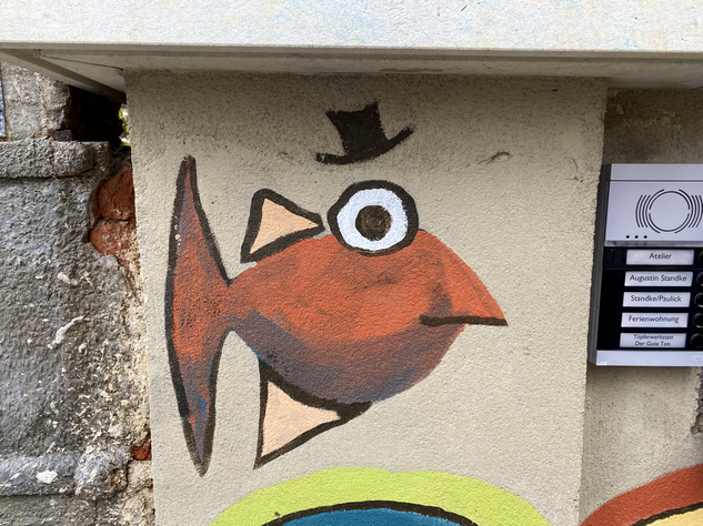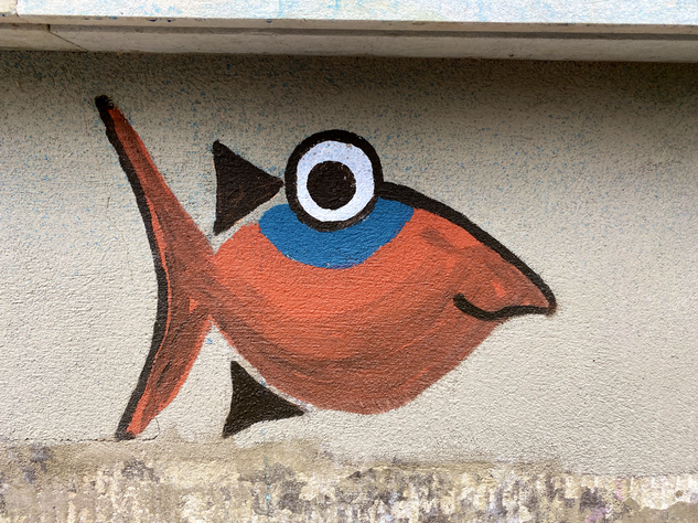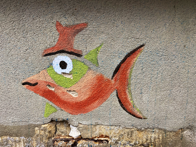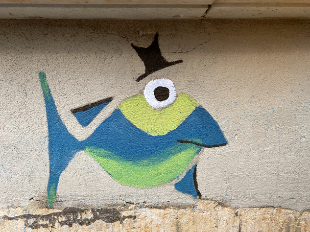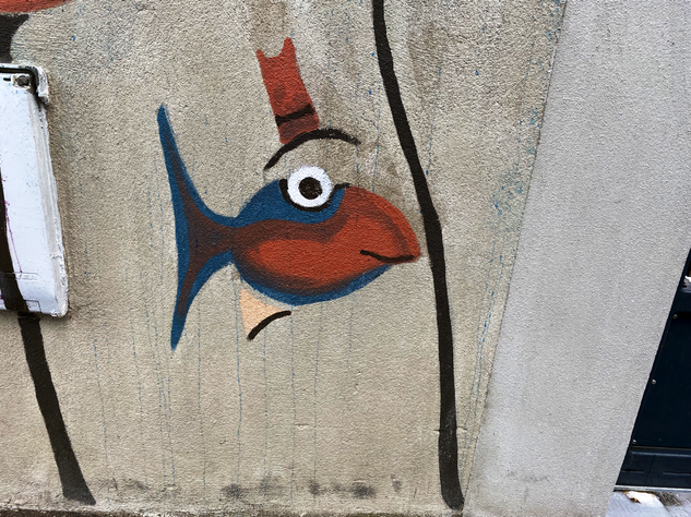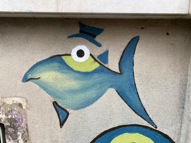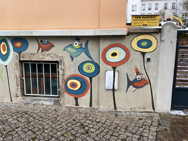 Streetart muss nicht immer krass sein. Streetart kann auch einfach schön sein. Ein Beispiel dafür sind die lustigen, „behüteten” Fische auf der Prießnitzstraße in der Dresdner Neustadt. Ein Haus ist über und über mit diesen lustigen Gesellen bemalt.