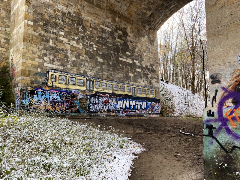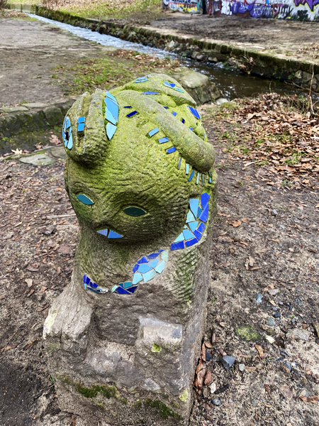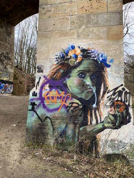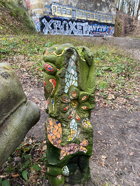 Street Art kann man an den verschiedensten Orten sehen. Die Begegnung bei einem Waldspaziergang ist allerdings für mich neu und ungewöhnlich. Geht man aber von der Neustadt aus durch den Prießnitzgrund, kann man aber genau das erleben. Entlang des kleinen Flüsschens Prießnitz muss früher auf der rechten Seite stadtauswärts ein Zaun gestanden haben. Den Zaun gibt es nicht mehr, aber die Zaunpfähle aus Sandstein sind stehen geblieben. An denen hat sich ein oder mehrere Street Art-Künstler versucht. Sie wurden bildhauerisch verändert und einige noch mit Glassteinen beklebt. Herausgekommen sind wirklich sehenswerte kleine Kunstwerke. Außerdem sind an den Pfeilern der Prießnitzbrücke noch zahlreiche Graffiti zu bestaunen. Also echte Street Art oder besser Forest Art :)).