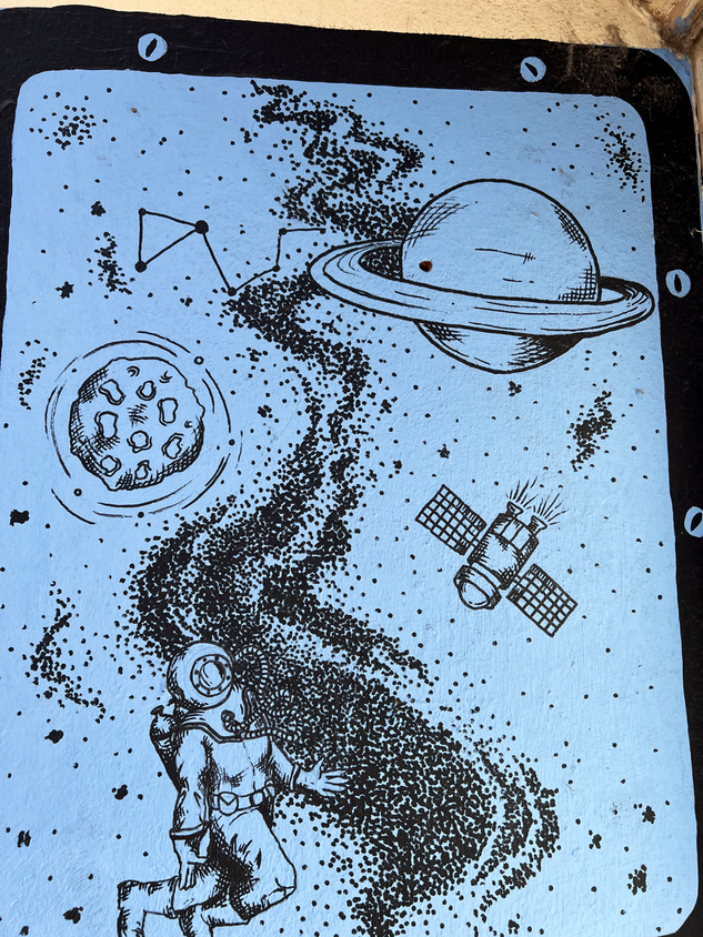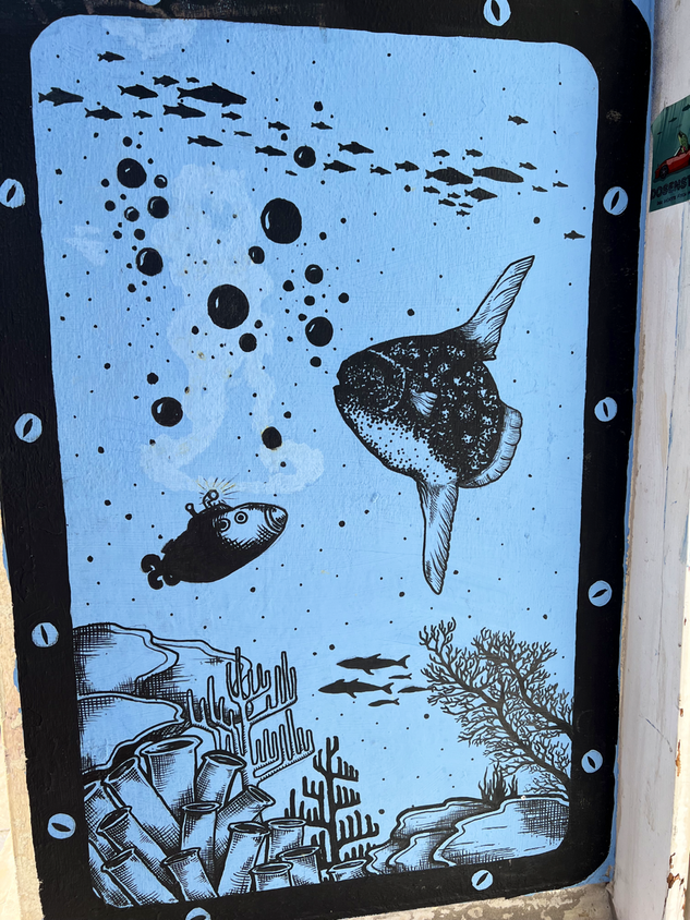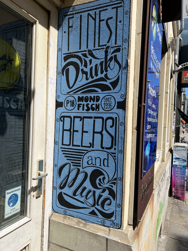 Besser hätte ich es nicht beschreiben können und es ist für mich auch nicht so wichtig. Mir geht es mehr um die sehr liebevolle und tolle Gestaltung des Eingangsbereiches der Bar. So sind die Rolladen der Fenster mit großen Graffiti versehen die natürlich zum Thema Mondfisch passen. Der Eingangsbereich links und recht ist mit futuristischen Zeichnungen zum Thema Unterwasserwelt gestaltet. Toll auch die alten Metallbuchstaben mit dem Namen über dem Eingang. Für mich ganz klar ein super Beispiel für Streetart-Kunst im öffentlichen Raum - ganz passend zur Dresdner Neustadt. Und wer weiß, vielleicht gehe ich ja sogar mal in die Bar rein?