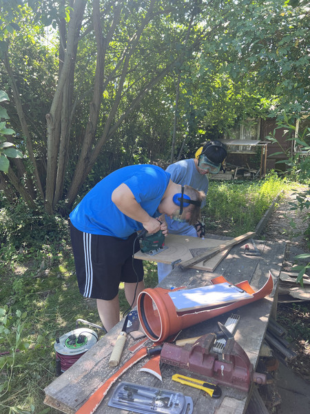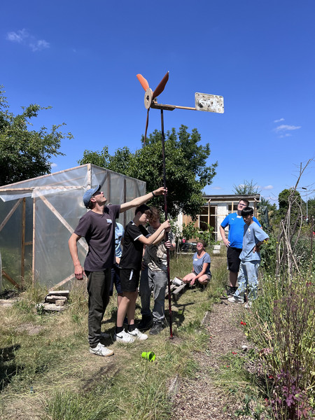 Zum Abschluss des Schuljahres im Halbe-Halbe Projekts waren wir in einem Kleingarten in Paunsdorf zu Gast – mitorganisiert vom Verein Querbeet Leipzig e.V. Dort haben wir versucht, aus recycelten Materialien ein eigenes Windrad zu bauen, um Strom zu erzeugen. Mit viel Engagement und Teamarbeit wurde gesägt, gehämmert und geschraubt. Am Ende stand das Windrad – und drehte sich sogar kurz im Wind! Neben der handwerklichen Arbeit spielte auch das Miteinander eine große Rolle. Bei strahlendem Sonnenschein genossen wir ein leckeres Mittagessen mit frischem Obst und Gemüse direkt aus dem Garten. Ein gelungener, kreativer Tag zum Abschluss unseres Projektjahres! |