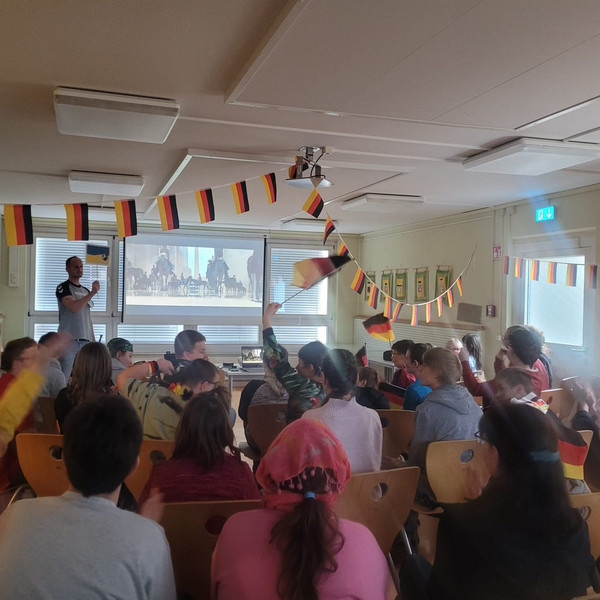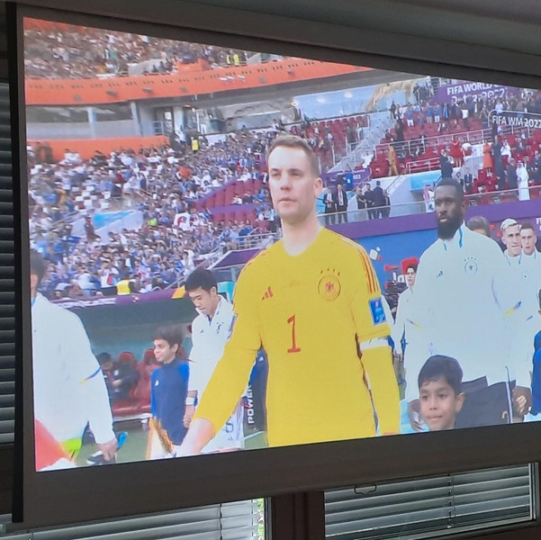 Für europäische Länder die erste Winter-WM der Geschichte! Und da das Spiel Deutschland gegen Japan am 23.11.22 bereits 14 Uhr angepfiffen wurde, konnte das erste WM-Public-Viewing in der Geschichte der Astrid-Lindgren-Schule stattfinden. Was dann passierte, war einfach nur überragend: Stimmung wie in einem echten Stadion! Stadiongesänge, Fanutensilien, Trommelrhythmen, Banner, Jubeln, Fluchen und vieles mehr. Die Stimmung am Siedepunkt, die Lautstärke deutlich darüber hinaus.