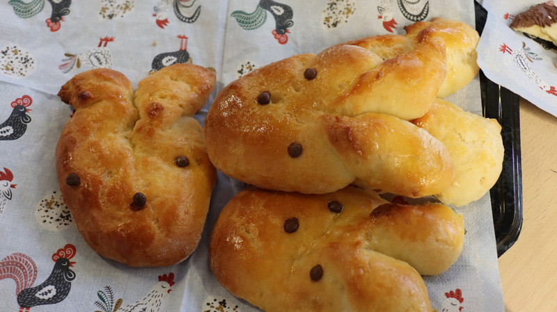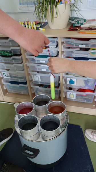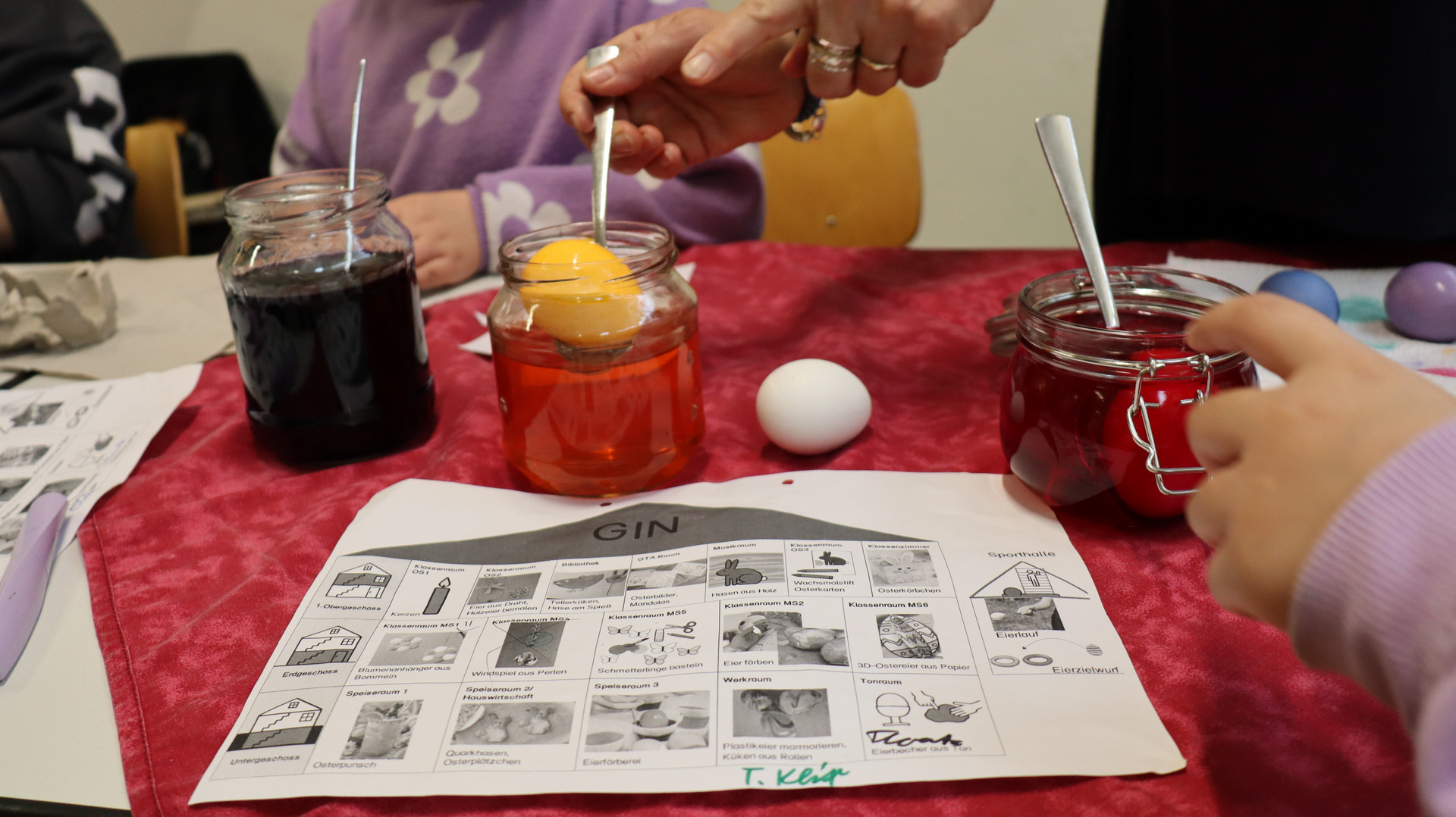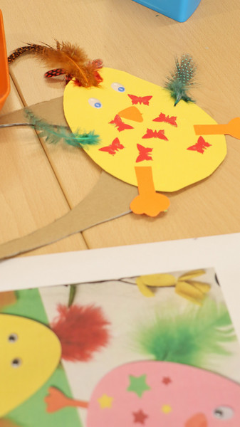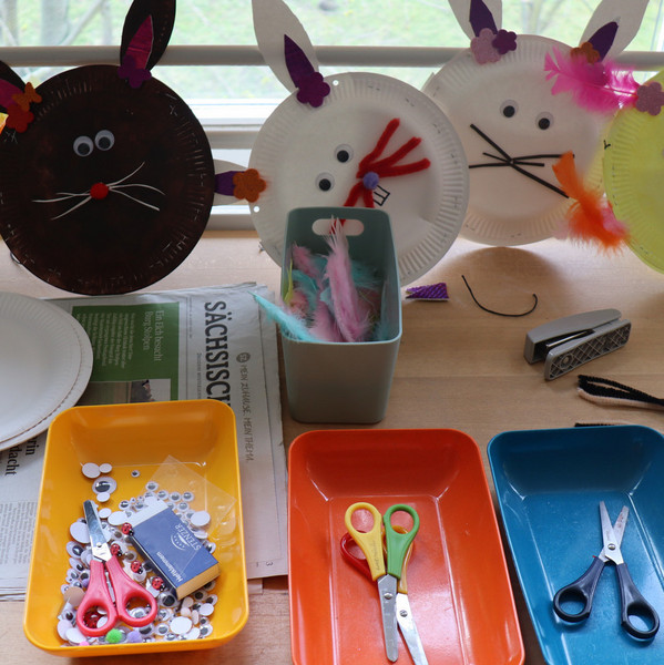 Zwei Wegweiser zeigten, welche Angebote auf die Kinder warten und wo diese zu finden sind. So konnten die meisten von ihnen eigenständig entscheiden, was sie als kleines Ostergeschenk für ihre Familie, Freunde oder für sich selbst anfertigen möchten. Im Laufe des Vormittags entstanden bunte Kerzen, verschiedene Osterkarten, Papiertulpen, Küken und Osternester aus Papptellern, Osteranhänger aus Holz, Klorollen-Häschen, Blumen aus Filtertüten oder Krepppapier, Miniostertöpfe und Ostertüten. Und natürlich wurden auch Ostereier bunt gefärbt.