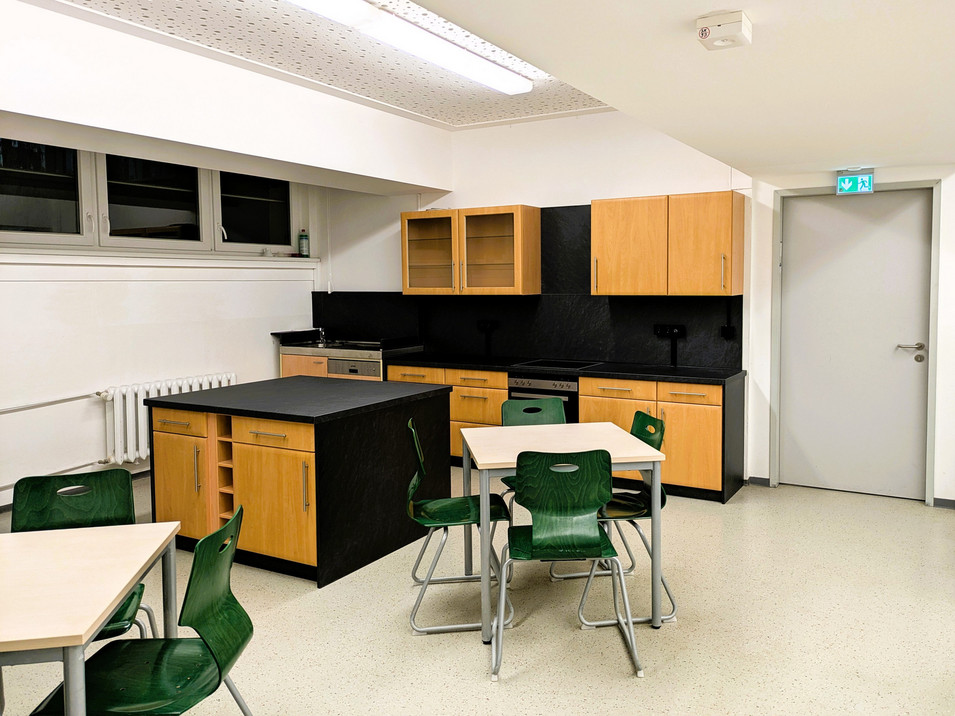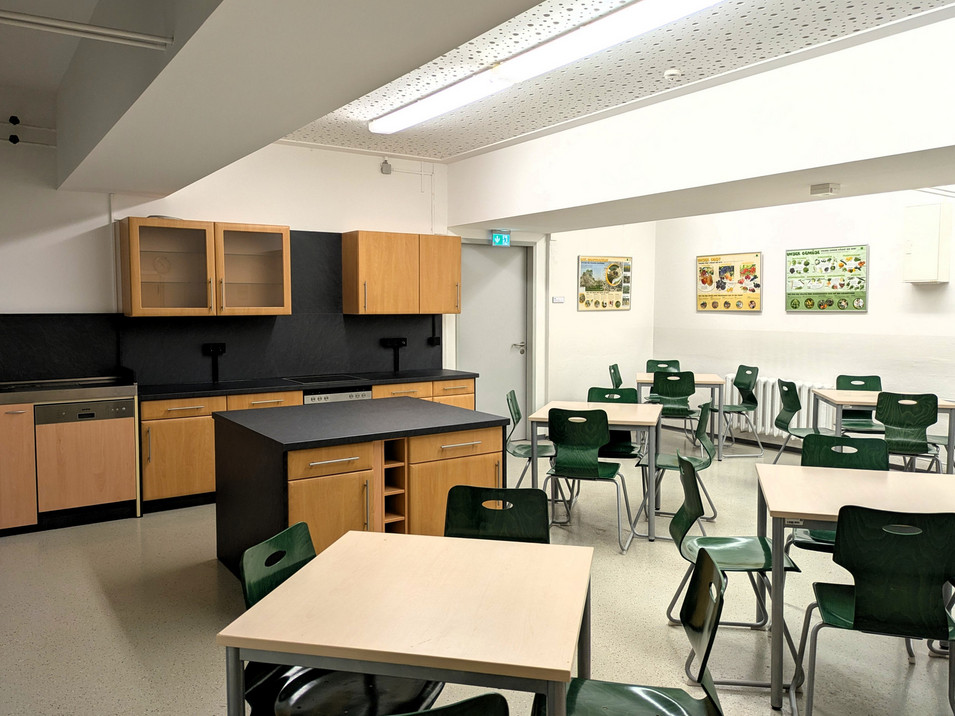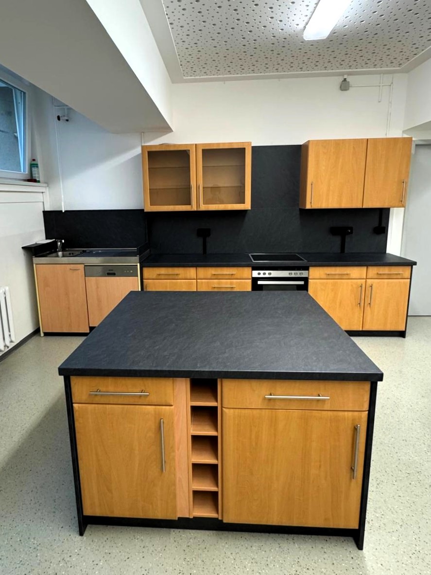 Ausgestattet mit Geschirrspüler, E-Herd mit Kochplatten, Spüle, Schränken und einer Insel-Arbeitsfläche können die Kinder im Projekt "Gesunde Ernährung" nun richtig kochen und backen.