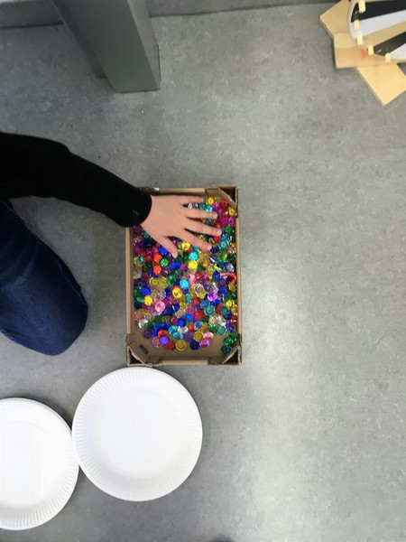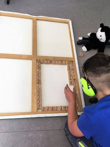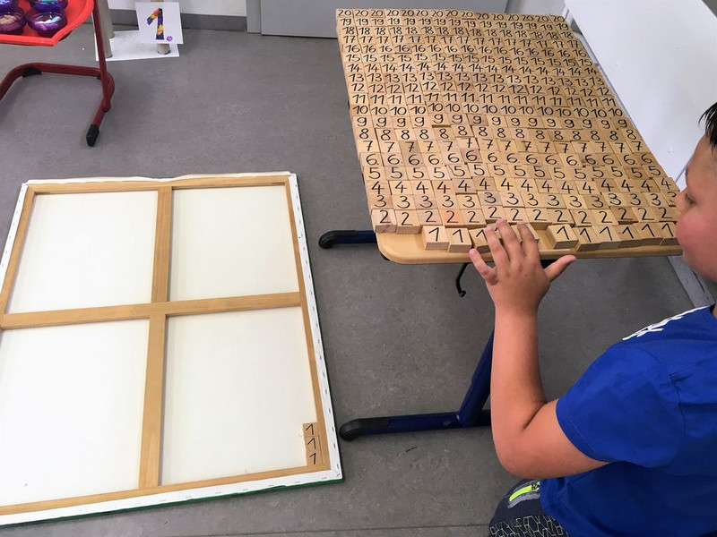 Einige Bausteine sortiert er in einen großen Rahmen ein. Er zählt immer wieder nach.