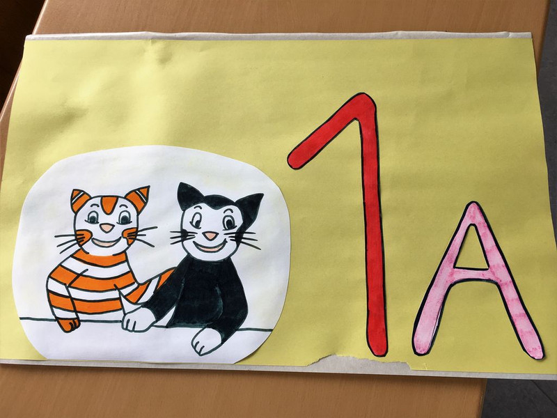 Frau Staab hat 2 Schilder an die Tafel geheftet: