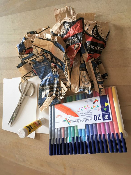Fasermaler, Buntstifte, Schere, Leimstift, Papier.