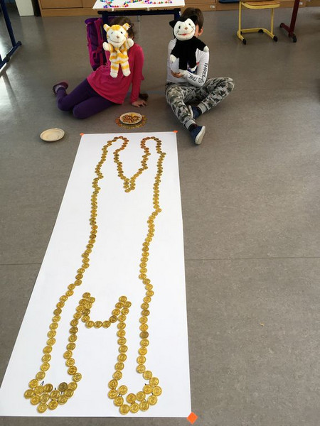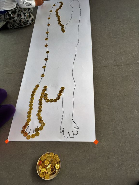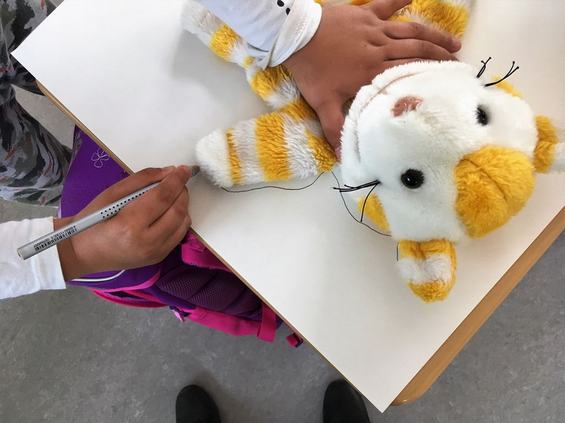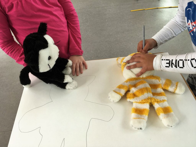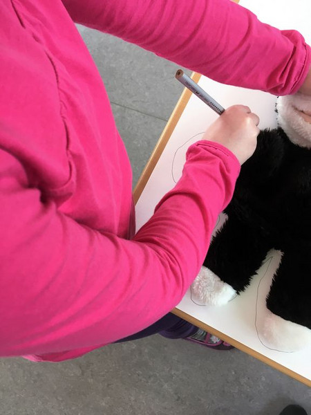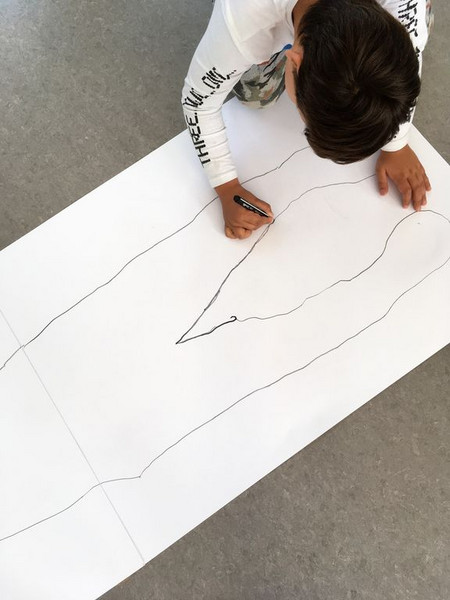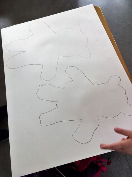 Julian hat sich auf ein großes Blatt Papier gelegt und Zara hat seinen Umriss nachgezeichnet.