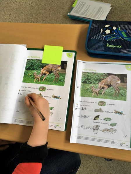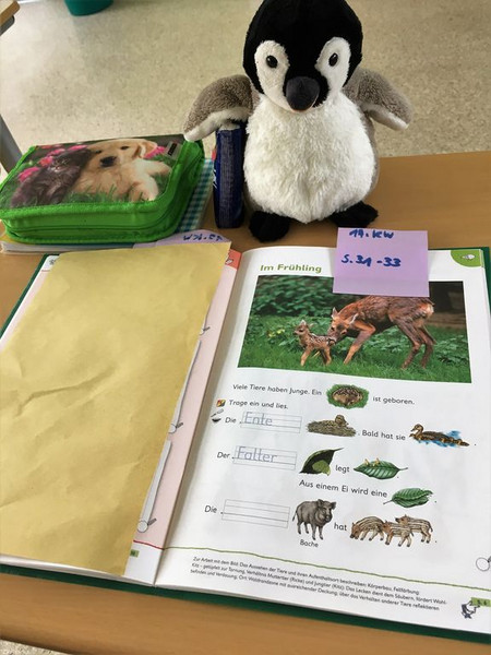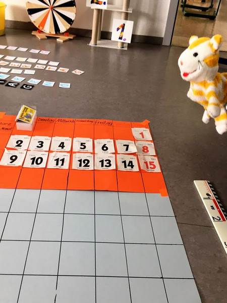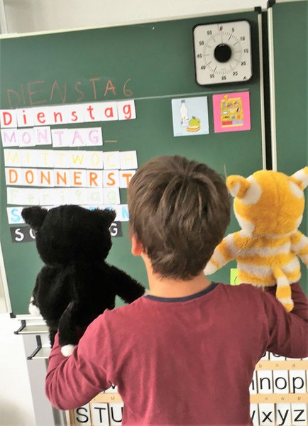 welches neben der Tafel hängt und einen Fasermaler.