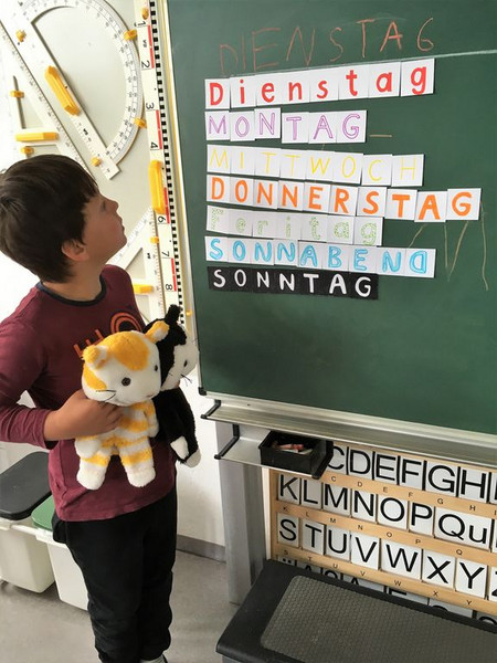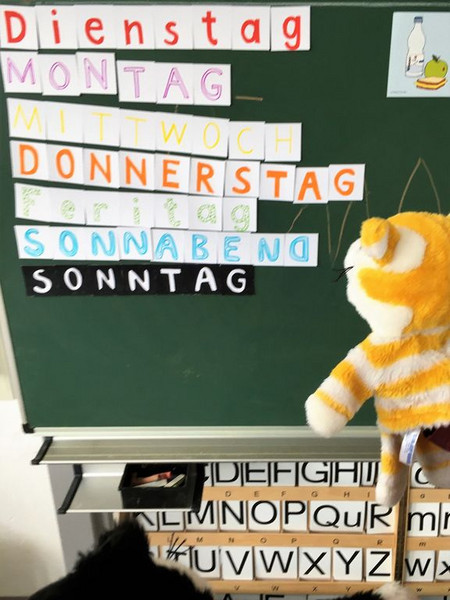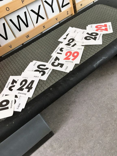 Er heftete auch die Buchstabenkärtchen an,