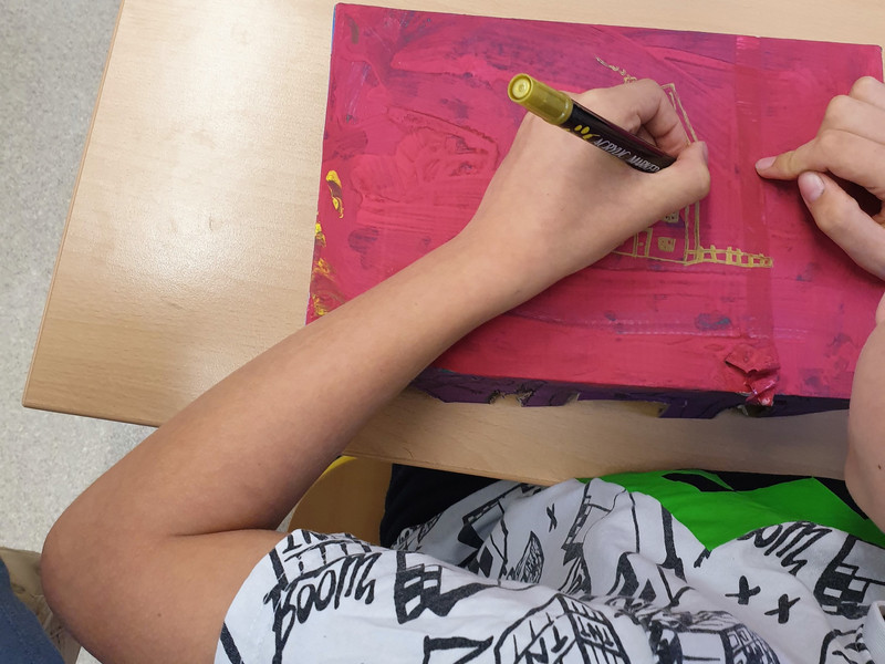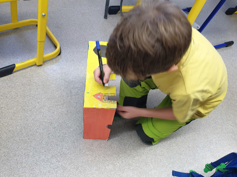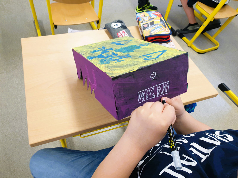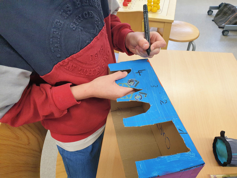 Jedes Kind der Klasse 3b hat sich ein Murmelspiel selbst gebaut und gestaltet. Dazu wurde ein Schuhkarton zurecht geschnitten, so dass vier unterschiedlich breite Tore entstanden, durch die später die Murmel geschnippst wird. Dann wurden die Kisten phantasiereich bemalt und verziert. Zum Schluß kam über jedes Tor eine Nummer von 1 bis 4, das war die jeweilige Punkteangabe, die erreicht werden konnte, wenn die Murmel es in ein Tor geschafft hat. Dabei war natürlich die höchste Punktzahl beim schmalsten Tor erreichbar, dort ist das Treffen ja am schwierigsten. Und dann konnte der Murmelschnippswettkampf starten. Aber nicht nur Fingerfertigkeit war gefragt, sondern auch ein wenig Köpfchen, denn die erreichten Punkte mussten ja schließlich auch noch zusammengezählt werden. Das war echt spannend und hat Riesenspaß gemacht.