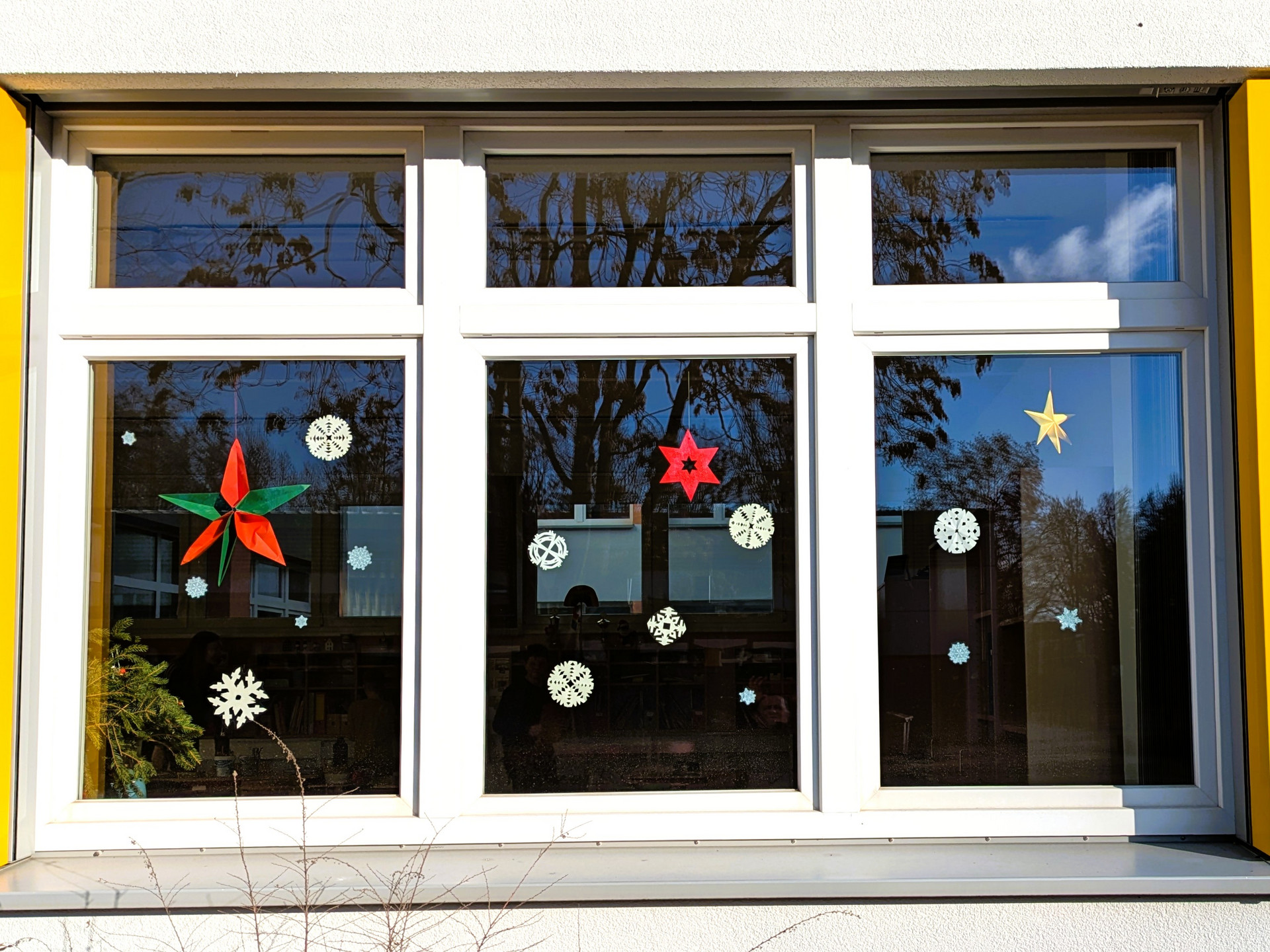 Die Klasse 4b hat schöne Weihnachtsdekoration für die Fenster ihres Klassenzimmers gebastelt.