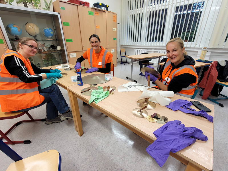 Diesmal benötigten die Zimbeln und Becken unserer Orff-Instrumente aus dem Musik- und Rhytmikunterricht besondere Zuwendung: die Instrumente sind mit der Zeit schon etwas "ergraut", die dunkle Färbung trübt nicht nur das Ansehen sondern auch den Klang und diese Patina musste nun entfernt und die Instrumente wieder schön poliert werden. Die Mitarbeiterinnen von GlaxoSmithKline haben das richt gut hinbekommen, alles blitzt und blinkt, damit letzendlich auch alles wieder gut klingt.