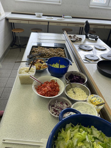 Zuerst ging es an die Vorbereitung. Gemeinsam wurden Zutaten besprochen, Arbeitsplätze eingerichtet und die einzelnen Schritte geplant. Frisches Gemüse wie Salat, Tomaten und Gurken wurde gewaschen und geschnitten. Auch die Soßen haben die Schüler selbst angerührt.