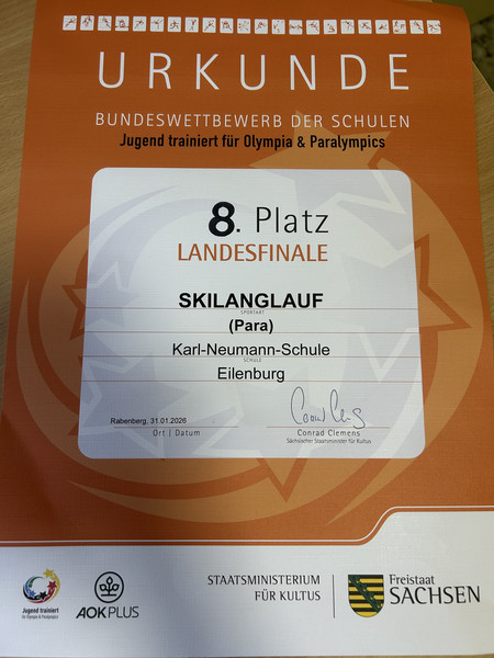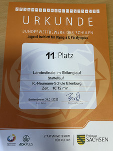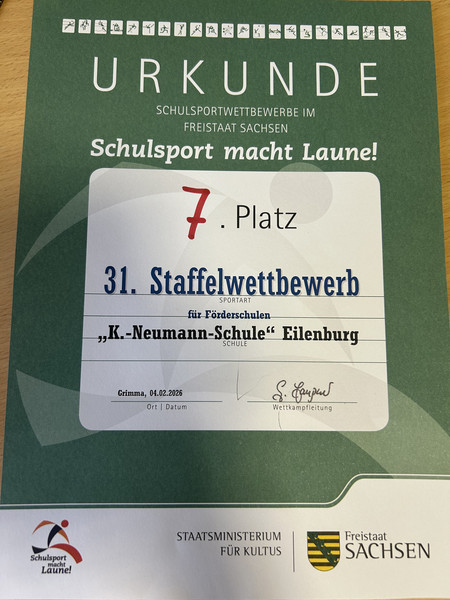 Am 4. Februar fuhren 12 Mädchen und Jungs der Karl-Neumann-Schule zum Staffelwettkampf "Schulsport macht Laune" nach Grimma. Sie rannten, hüpften, schlitterten, bauten, warfen und zeigten vor allem Kampfgeist und Zusammenhalt. Aber natürlich hatten alle richtig viel Spaß und irgendwie waren ja alle Sieger! Wir haben den 7. Platz erreicht und sind darauf sehr stolz.