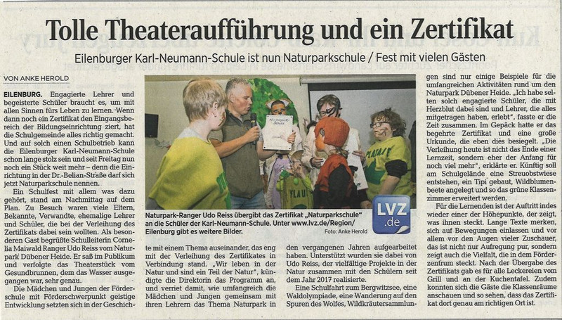 Am 3.5.2019 war es soweit: wir haben die Zertifizierung zur Naturparkschule erhalten. In einem Festakt überreicht uns Herr Reis vom Naturpark Dübener Heide e.V. die Urkunde, die uns als Naturparkschule ausweist. In den nächsten fünf Jahren werden wir in enger Zusammenarbeit mit dem Naturpark Projekte iniitieren, die unseren Schülern und Schülerinnen vielerlei Aspekte einer nachhaltigen Entwicklung erfahrbar machen. Wir freuen uns und sind gespannt auf die Zusammenarbeit und werden an dieser Stelle hier über die weiteren Projekte informieren.