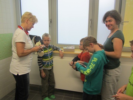 Im Oktober besuchten die Klassen 3 und 4 den Hobbyimker aus Leidenschaft, Herrn Rendke. Eines wussten wir: Imker züchten Bienen, um Honig zu gewinnen. Bereitwillig erklärte er uns, dass ein Bienenstock das Haus der Bienen ist. Er öffnete für uns einen leeren und erläuterte die beiden Etagen, den Brutraum und den Honigraum. Im Inneren sahen wir Rahmen, auf diesen erkannten wir sechseckige Wachszellen. In diese füllt dann eine Biene ihre Tröpfchen Nektar und verschließt es. Gebannt hören alle zu. Weiterhin erzählte er, dass die Honigernte eigentlich das Spannendste an seinem Hobby wäre, weil er nie weiß, wie fleißig seine Bienen gewesen sind. Mutige Schüler konnten beweisen, wie geschickt sie mit Imkerhut und Messer die Wachsdeckel, die die Bienen gebaut hatten, öffnen konnten. Ach es gäbe noch so viel zu berichten, wie z. B. das Honigschleudern. Geduldig beantwortete Herr Rendke all die zahlreichen Fragen. Zum Schluss durfte jeder von uns, von zwei selbstherstellten Honigsorten naschen, hm war das lecker!
