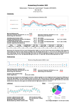 Die erste Monatshälfte war deutlich zu warm, am Rand eines atlantischen Tiefdruckkomplexes und eines kräftigen Hochdruckgebietes über Südosteuropa gelangte milde Luft in unsere Region. Danach folgte ein markanter Kälteeinbruch. Ursache dieser Abkühlung war Arktikluft, die unter Hochdruckeinfluss und bei klaren Nächten für Temperaturen im strengen Frostbereich sorgte (Tiefsttemperatur 23.12.: -8,3 °C). Am Monatsende kam es zu einer deutlichen Frostabschwächung. Die Monatsmitteltemperatur lag mit 5,0 °C verglichen mit dem Mittel 1991-2020 (5,0 °C) im Durchschnitt.
