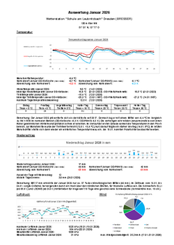 Dennoch lag er mit einem Mittel von -0,4 °C im Vergleich zu 1961-1990 im normalen Bereich (DD-Klotzsche +0,3 K / DD-Pillnitz -0,3 K). Die vorherigen sehr milden Januarmonate lassen einen früher gewöhnlichen Wintermonat plötzlich extrem erscheinen. Im Verlauf der ersten Dekade sanken die Temperaturen in den Frostbereich, zur Monatsmitte wurde der Tiefstwert erreicht (12.01. -15,4 °C), kurz darauf folgte ein starker Anstieg (14.01. 8°C). Im letzten Monatsdrittel stellte sich dann wieder ein winterliches Temperaturniveau ein. Am 19.01. konnten Polarlichter beobachtet werden.
