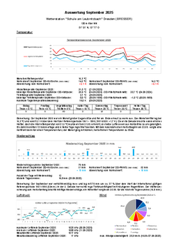 Damit lag die Temperatur 4,1 über dem Wert der Referenzperiode 1961 – 1990 (1991-2020: +3,7 K). Der Monat war damit sogar wärmer, als ein durchschnittlicher Juli (18,0 °C) und August (17,7 °C). Dazu kommt eine bemerkenswert hohe Anzahl von Sommertagen (19) und Heißen Tagen (7). Die Höchsttemperatur wurde am 11.09. mit 33,0 °C erreicht.