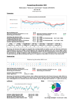 Wie schon im September dominierten im Oktober vielfach ruhige Hochdruckwetterlagen. Für Abwechslung sorgte der erste schwere Herbststurm „Hendrik“, der am 21.10. über Deutschland hinweg zog. Die Station Dresden-Klotzsche meldete Orkanböen bis 119,2 km/h und stellte einen neuen Monatsrekord auf. In der geschützteren Lage der Schule wurden 33,8 km/h gemessen (Luftdruck 997 hPa). Die Monatsmitteltemperatur lag mit 10,4 °C um 0,6 K über dem Wert der international gültigen Referenzperiode