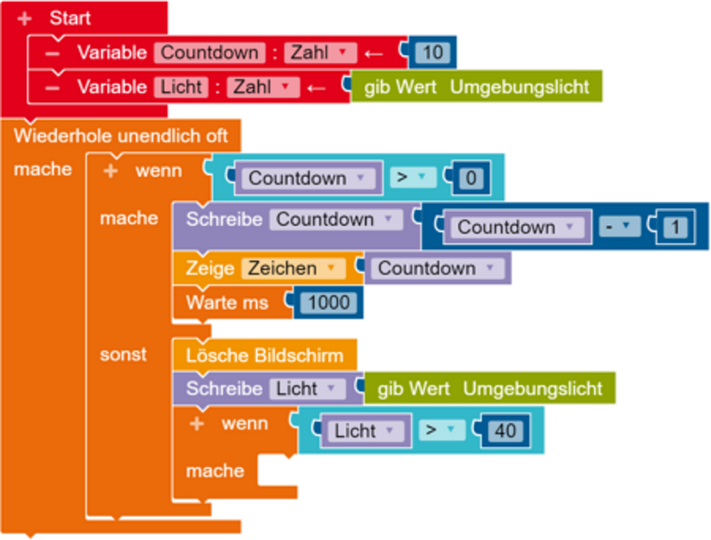 Das Programm startet mit einem Countdown von 10, der auf dem Display angezeigt wird. Sobald der Countdown bei 0 angelangt ist, überwacht der Calliope mini kontinuierlich die Lichtverhältnisse. Überschreitet die Helligkeit einen bestimmten Schwellenwert (zwischen 0 und 255), aktiviert der Mini den Alarm – z. B. durch blinkende LEDs, einen Piepton oder die Anzeige des Texts "Alarm"