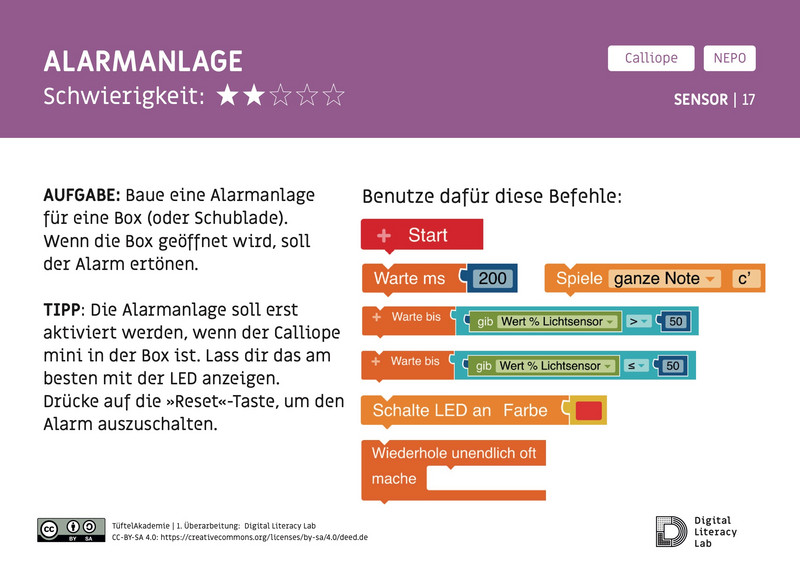 Der "Keksalarm" ist ein Programm für den Calliope mini, das als einfache Alarmanlage funktioniert, um beispielsweise Kekse vor Dieben zu schützen. Der Mini nutzt seinen Lichtsensor, um Veränderungen der Helligkeit zu messen. Wird es plötzlich heller (z. B. weil jemand die Keksdose öffnet), löst der Alarm aus