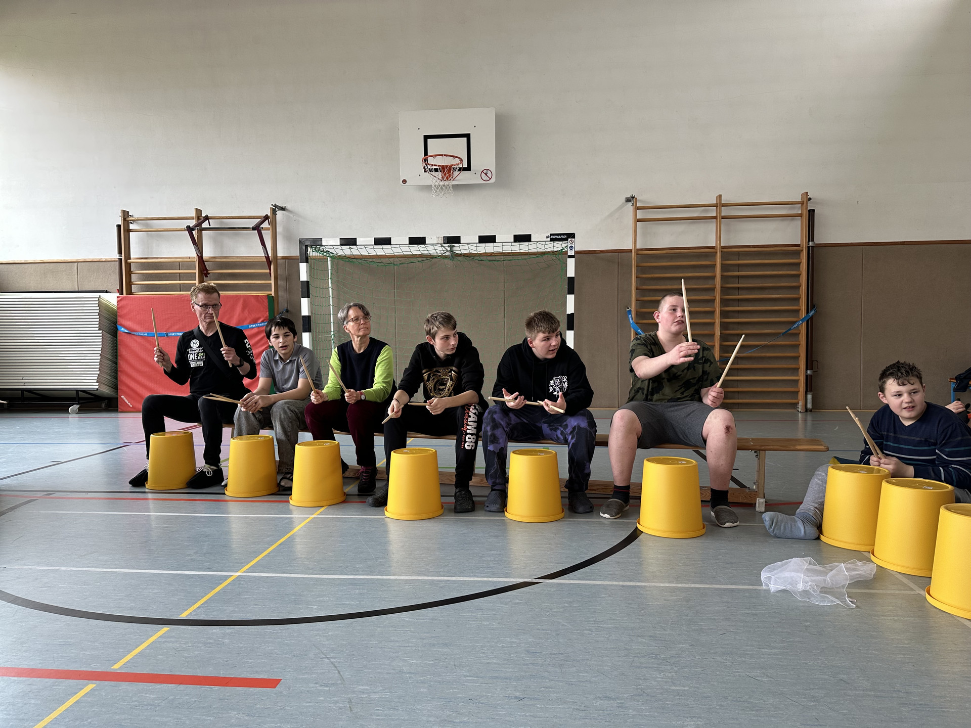 Zu Beginn spielten sie einige Lieder vor und stellten ihre Instrumente vor. So erhielten alle einen spannenden Einblick in die Vielfalt und den besonderen Klang der Band. Anschließend gingen die Werkstufen in ihre Workshops, während die Oberstufen in der Turnhalle blieben. Dort wurde auf Eimern getrommelt, Rhythmus geübt und mit viel Freude gemeinsam musiziert. Nach der Pause folgten Atemübungen, Beatboxen und Gesang mit Gitarrenbegleitung – ein energiegeladener Abschluss des Vormittags.