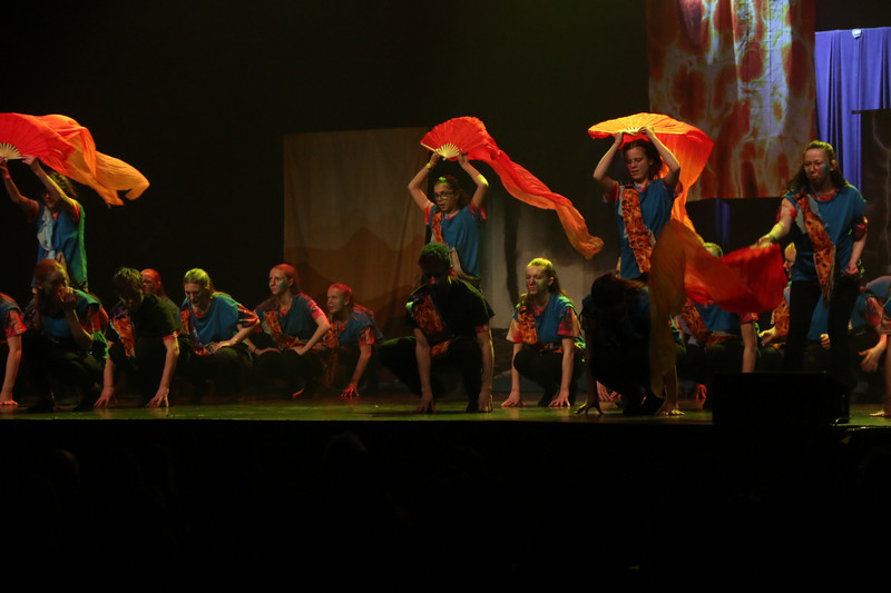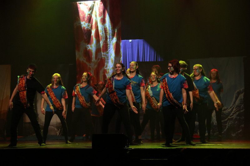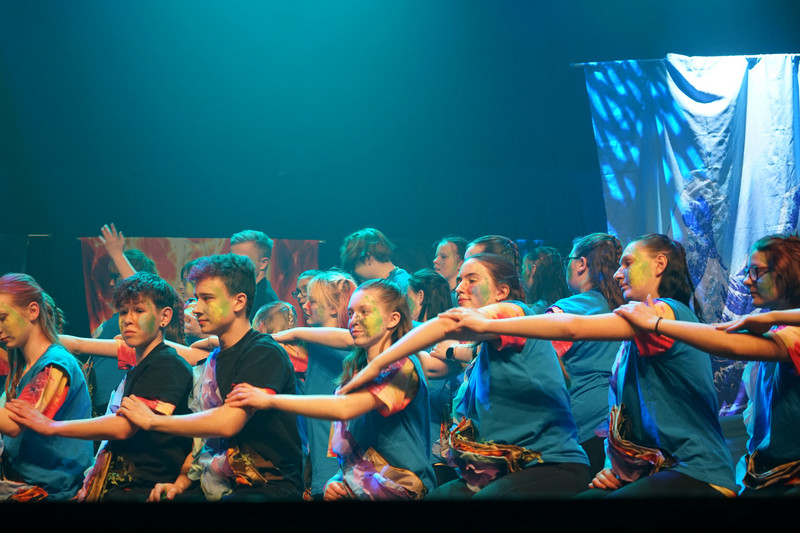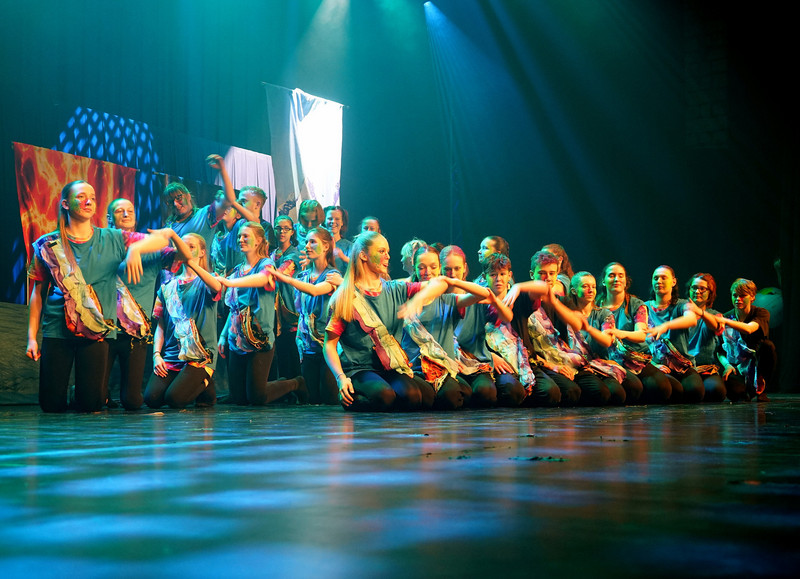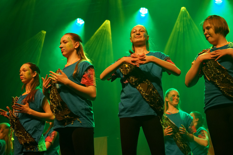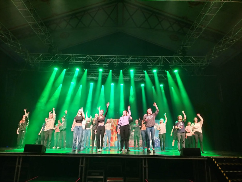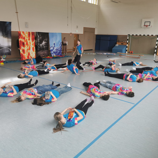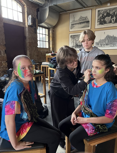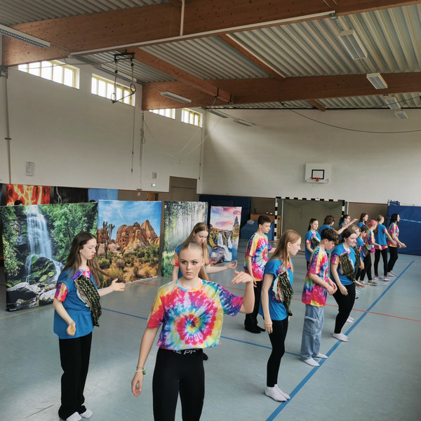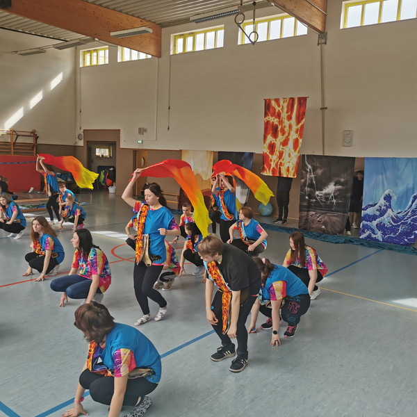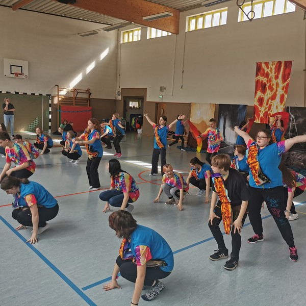 Weiterhin wurde fleißig im wöchentlichen Neigungsunterricht - Tanz - die Choreografie geübt und gefestigt. Alle Entscheidung zur Musikauswahl, der Kostümgestaltung und die des Bühnenbildes wurden gemeinsam getroffen.Über die technische Unterstützung für Lichtplan, Bühnenbild und Musik durch 3 Gymnasiasten freuten wir uns sehr.