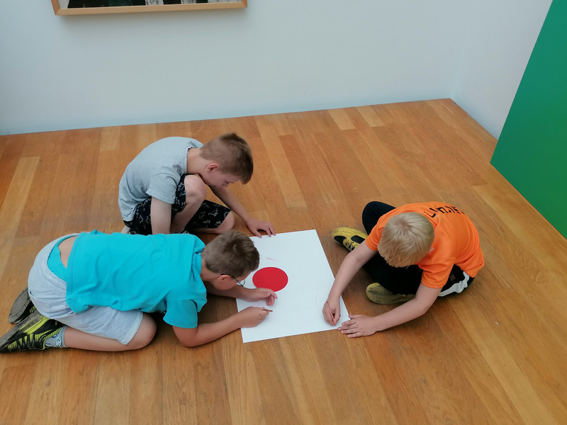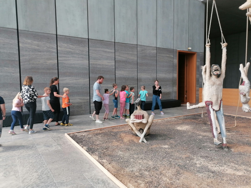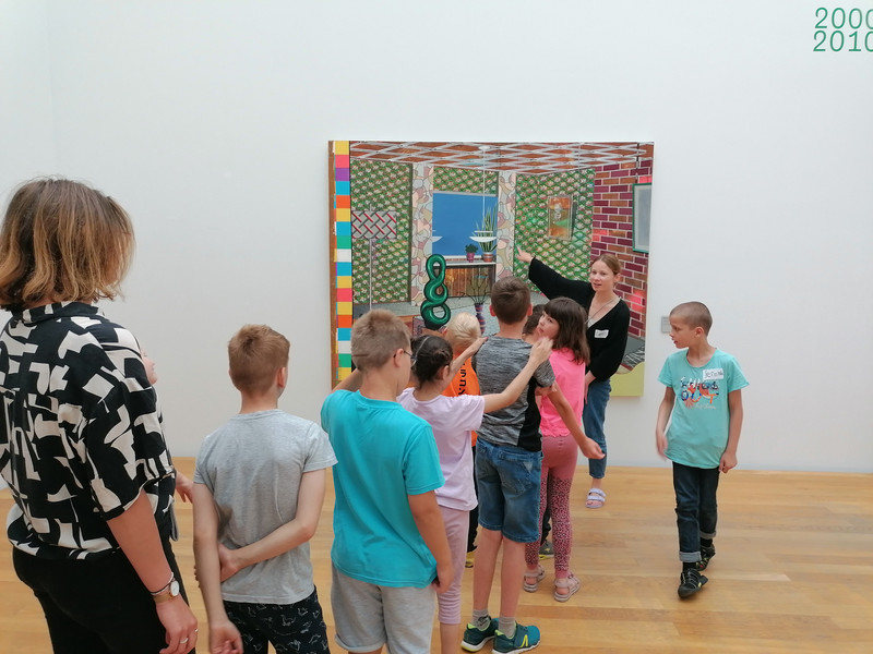 Am vergangenen Freitag fuhren alle Unterstufen gemeinsam in das Museum der bildenden Künste. Zwei Museumspädagoginnen zeigten uns Bilder und Installationen. In einer "Museumsschlange" bewegten wir uns durch die großen Räume. Wir durften uns selbst wie Kunstfiguren hinstellen, Farbaufträge anfassen und Farben mit Karten und Tüchern in Bildern suchen. Am Ende gingen wir in die Praxisräume des Museums: mit Wachsmalstiften und Tinte entstanden bunte leuchtende Bilder, die wir mit nach Hause nehmen durften.