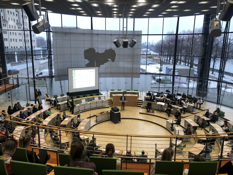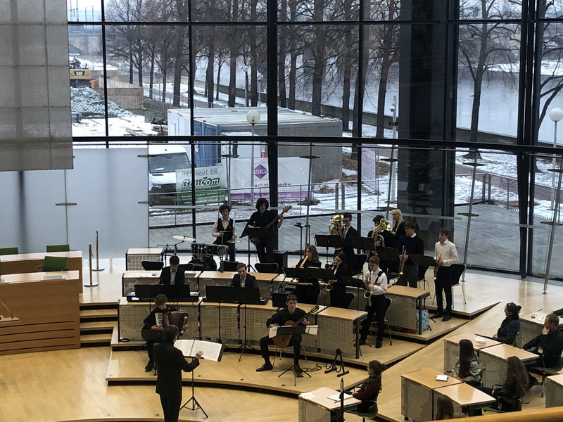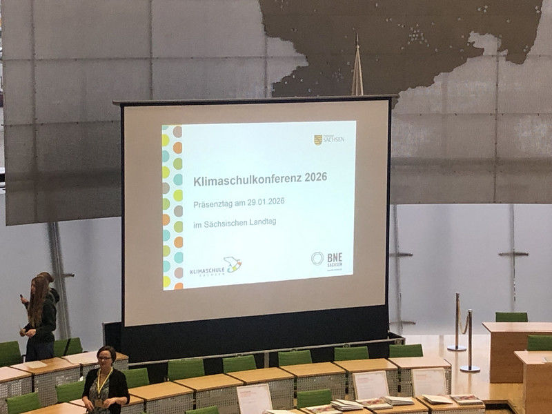 Am 29.01.2026 war es mal wieder so weit - Wir als bestehende Klimaschule haben an der 9. Klimaschulkonferenz teilgenommen. Dieses Mal galt die Einladung zu einem besonderen Ort der Demokratie, wir waren zu Gast im sächsischen Landtag. Mittlerweile routiniert, fuhren wir mit der DB in unsere schöne Landeshauptstadt Dresden. Gut versorgt mit kullinarischen Kleinigkeiten und grandioser Orchester-Musik konnten wir den Auszeichnungen der neuen Klimaschulen folgen und in Gruppenangeboten in den Ausstausch gehen. Nicht fehlen durfte eine kurze Stadttour, bevor es dann mit vielen Gedanken und rauchenden Köpfen, leicht geschafft zurück nach Leipzig ging.