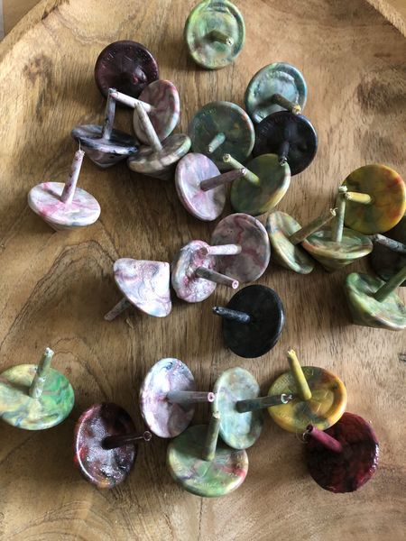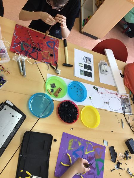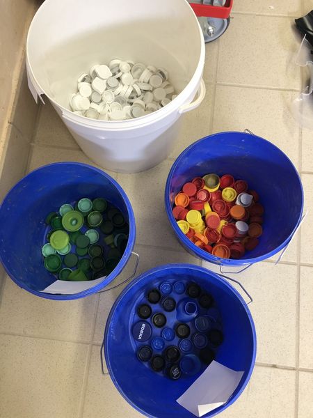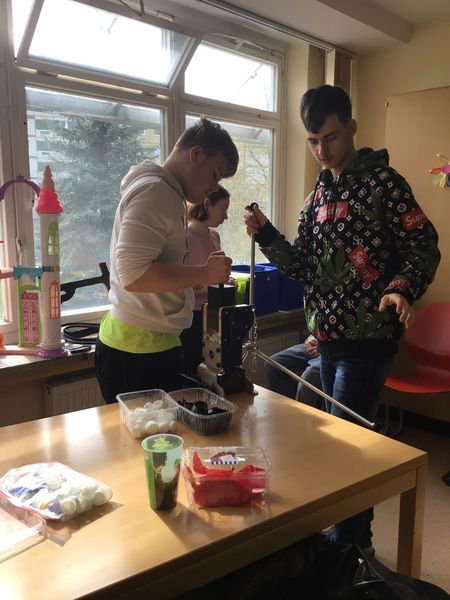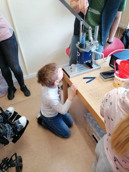 Das größte Highlight: Wir liehen uns vom Kunststoffzentrum Leipzig (KUZ) eine Recyclingmaschine aus und stellen selbst Kreisel her. Dafür sortierten wir verschiedene Plastikdeckel nach Farben, stellten Granulat daraus her und formten anschließend neue Kreisel in einer Spritz-Guss-Maschine. Ein schönes und interessantes Angebot für alle Schüler und das Personal, welches dann am Nachmittag an der Maschine stand, um Kreisel herzustellen.