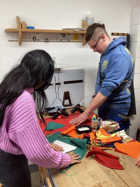 Für unsere Schule stellten wir eine Wimpelkette aus alten Stoffresten her, die immer weiter wachsen und zu Festen aufgehangen werden kann